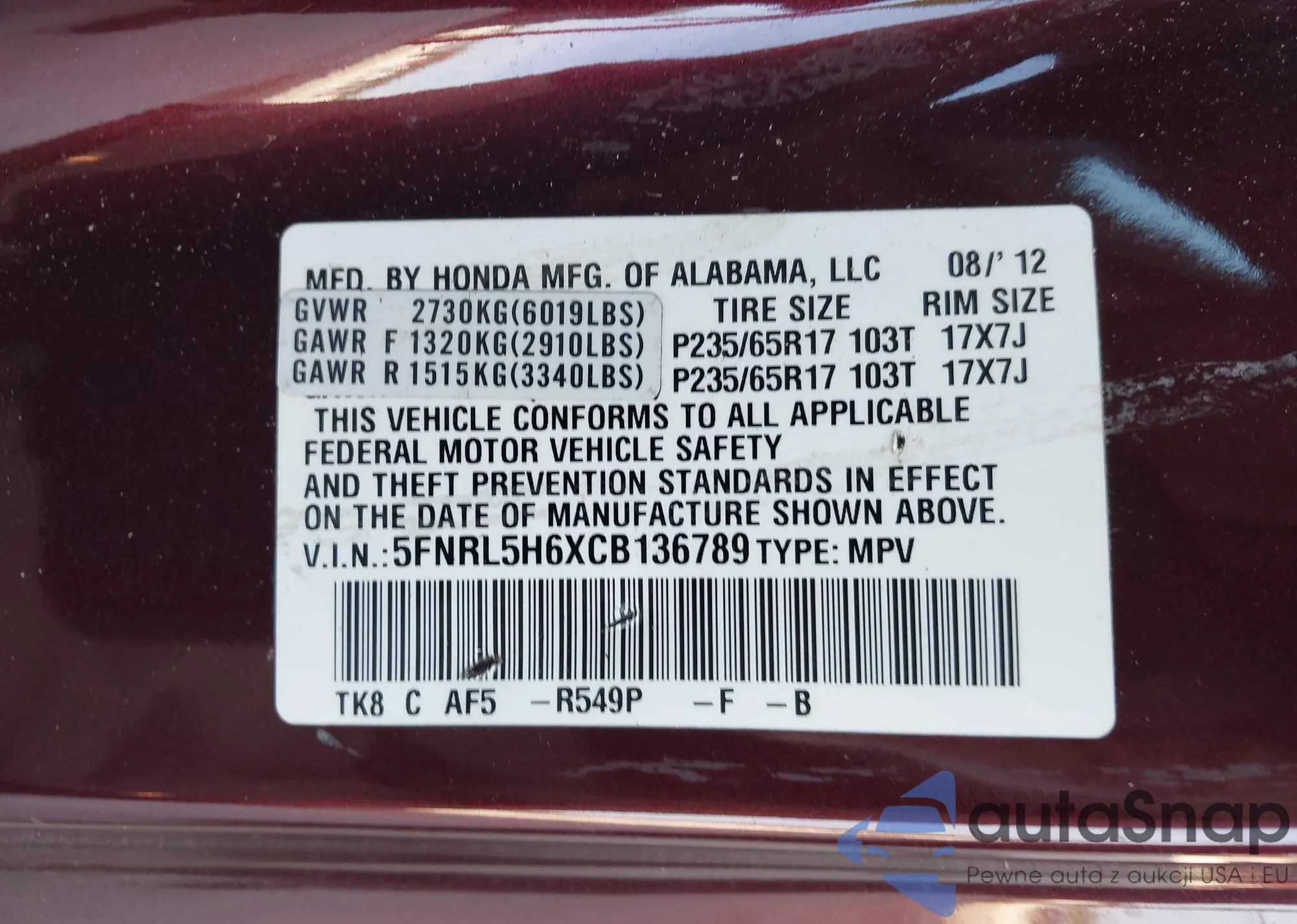 • VIN 5FNRL5H6XCB136789