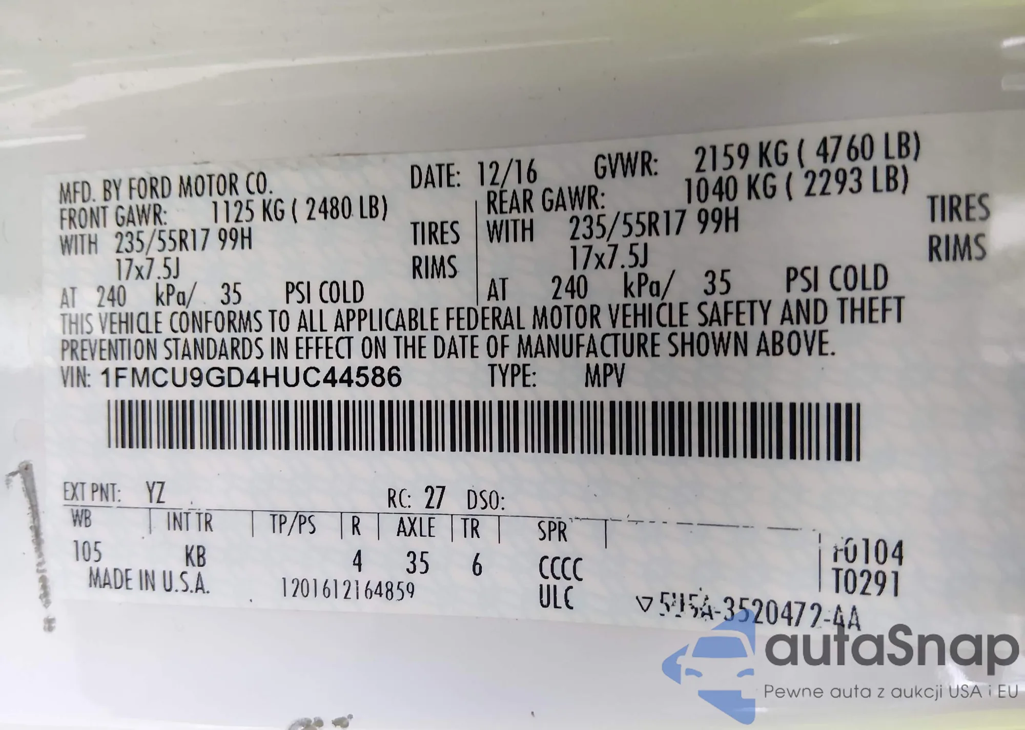 • VIN 1FMCU9GD4HUC44586