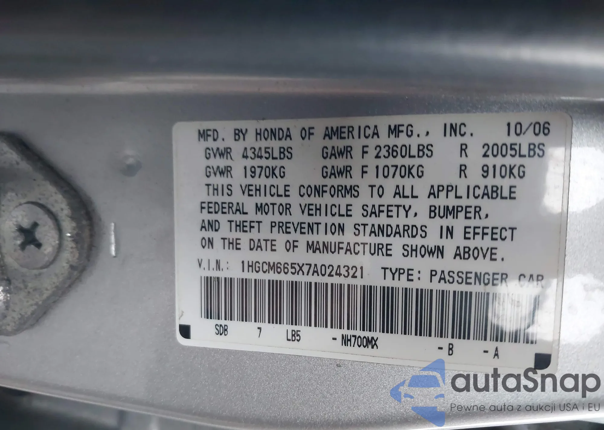 LOT: 44112918 VIN: 1HGCM665X7A024321