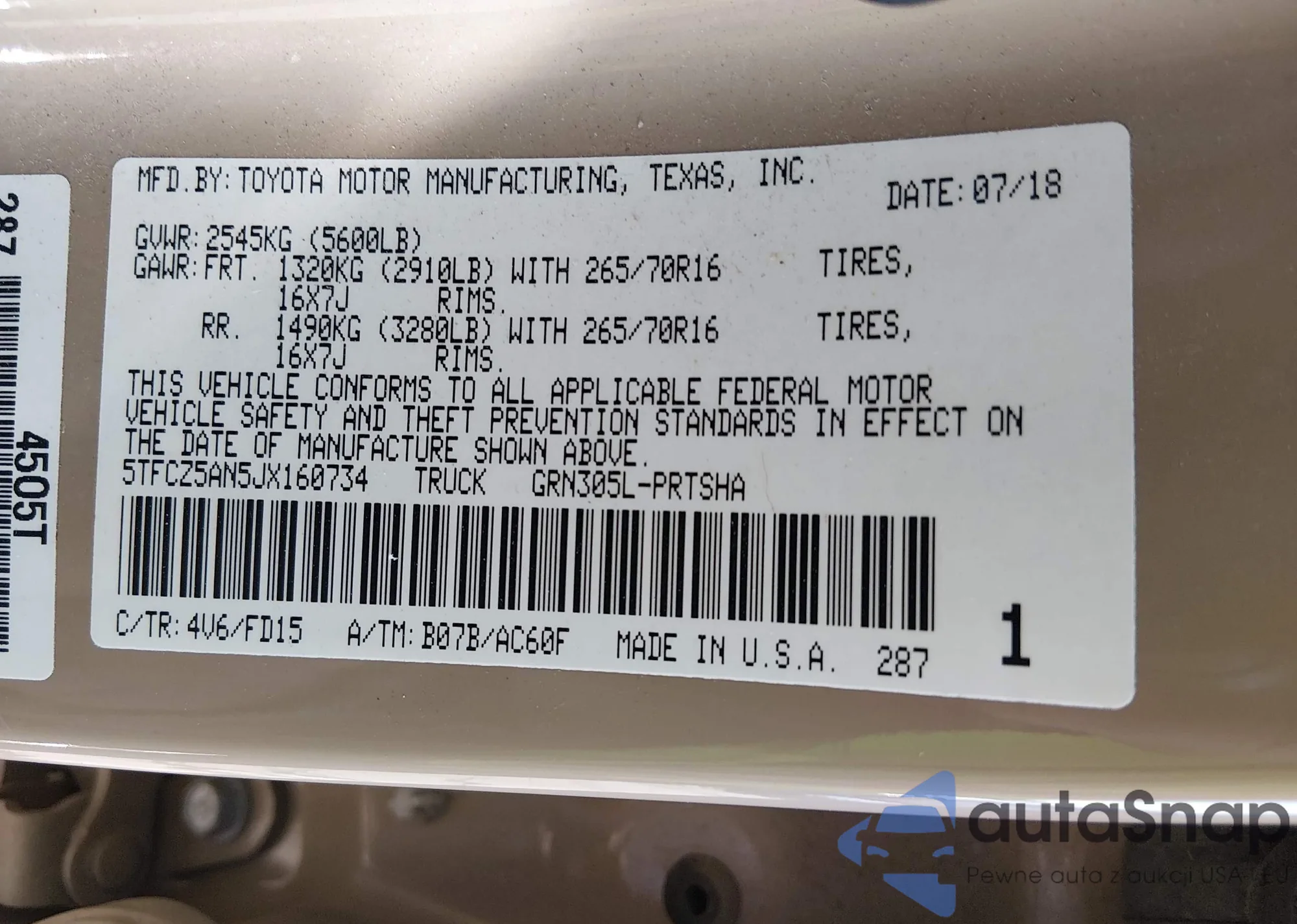 • VIN 5TFCZ5AN5JX160734