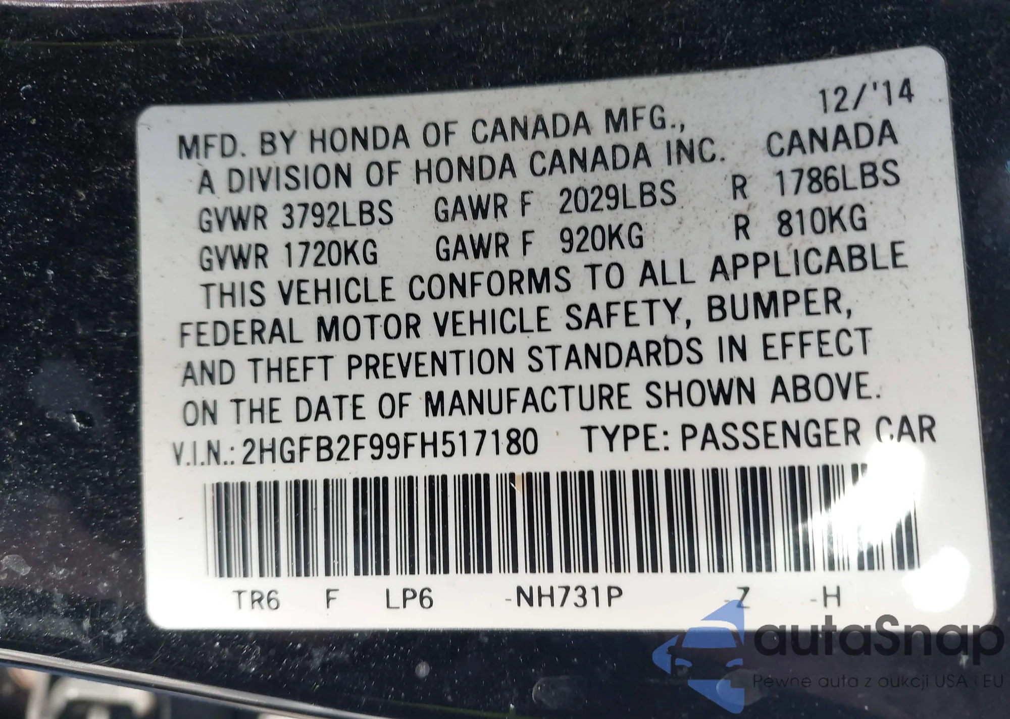 • VIN 2HGFB2F99FH517180
