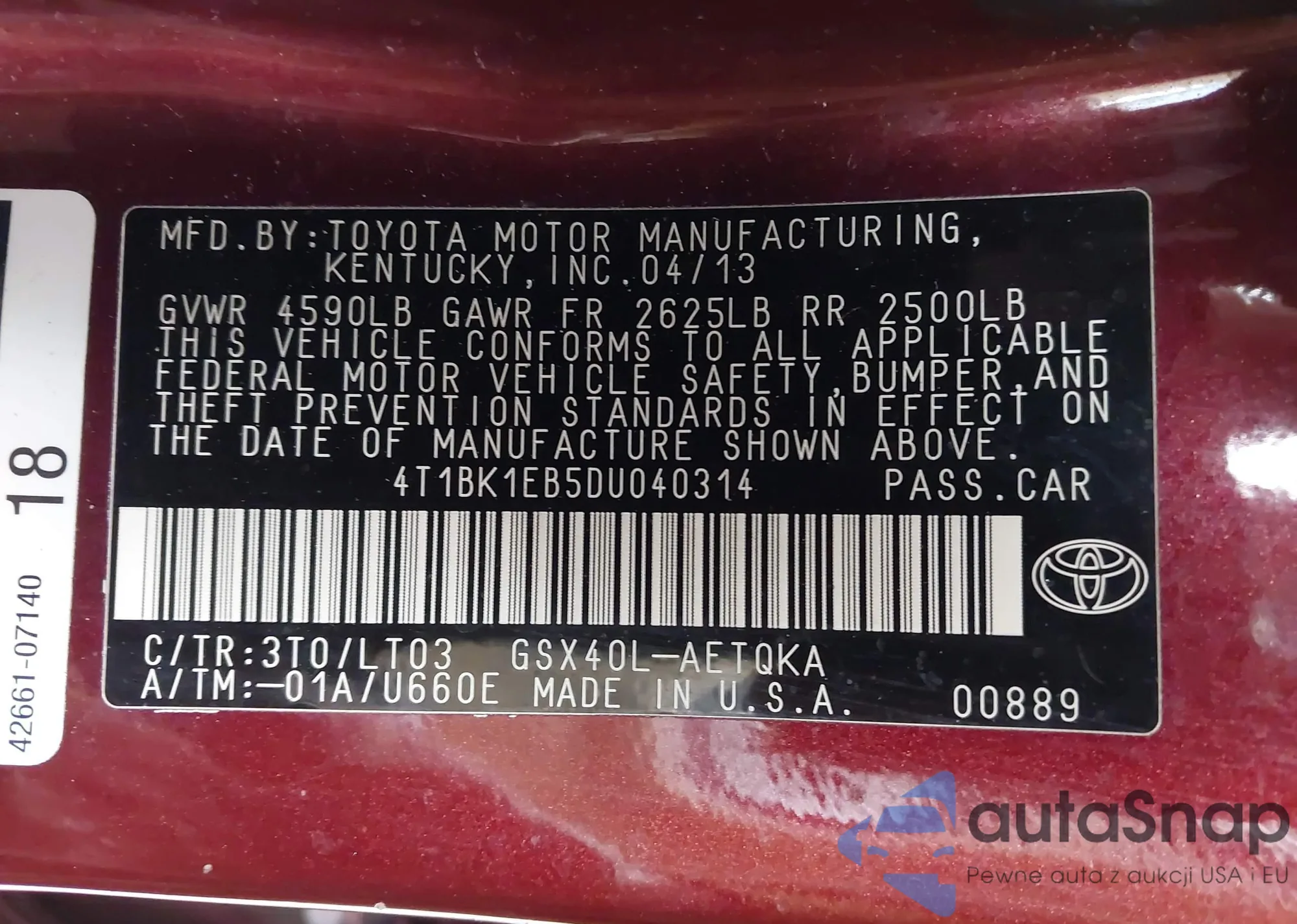 LOT: 44003990 VIN: 4T1BK1EB5DU040314