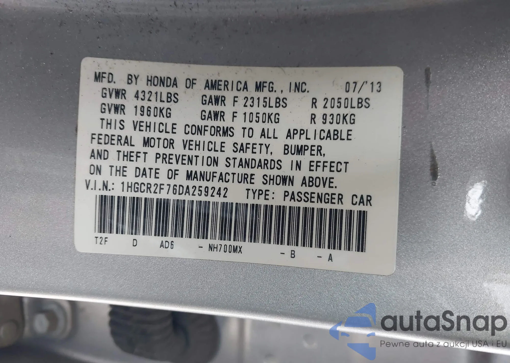 LOT: 43961441 VIN: 1HGCR2F76DA259242