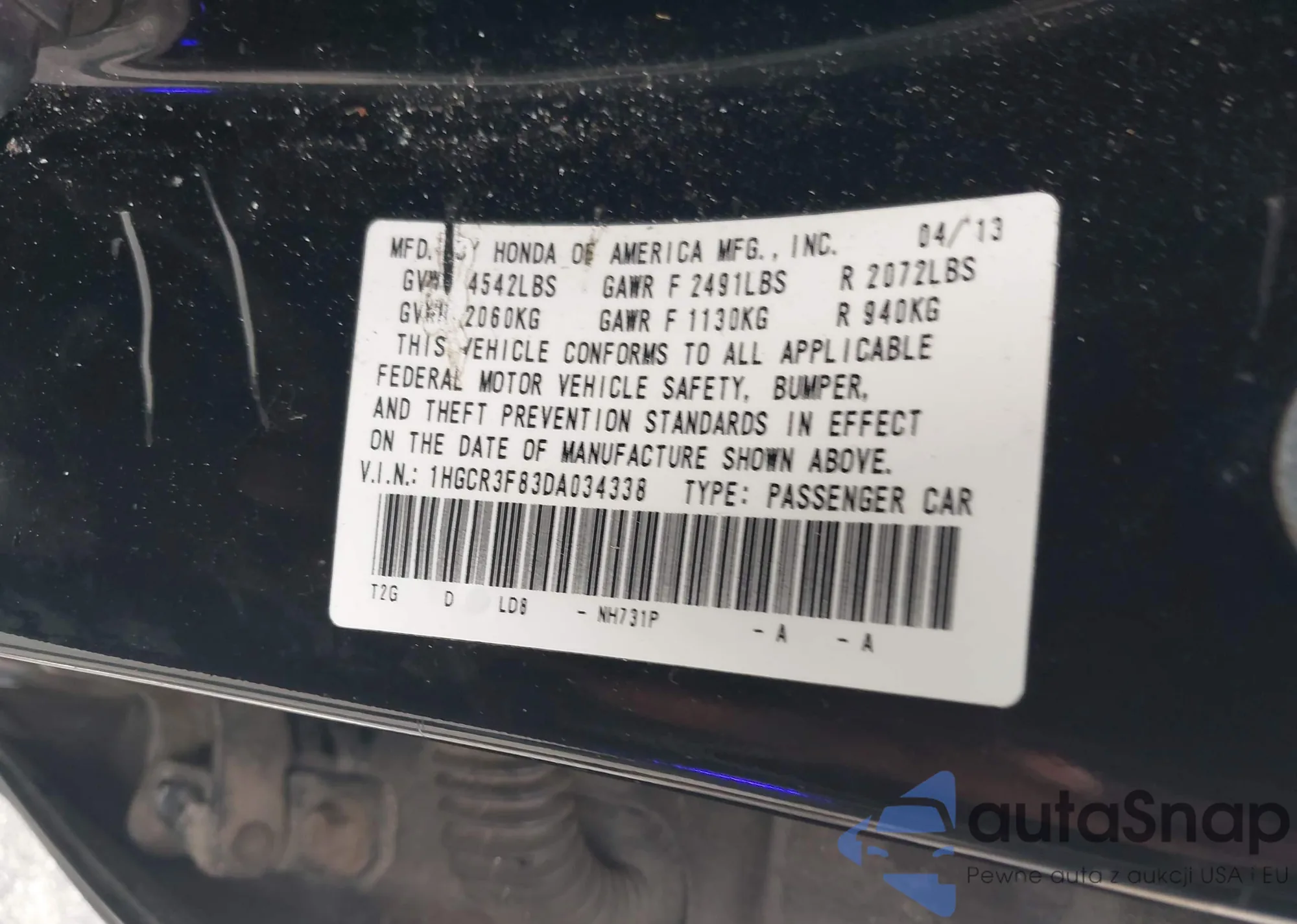 LOT: 43970764 VIN: 1HGCR3F83DA034338