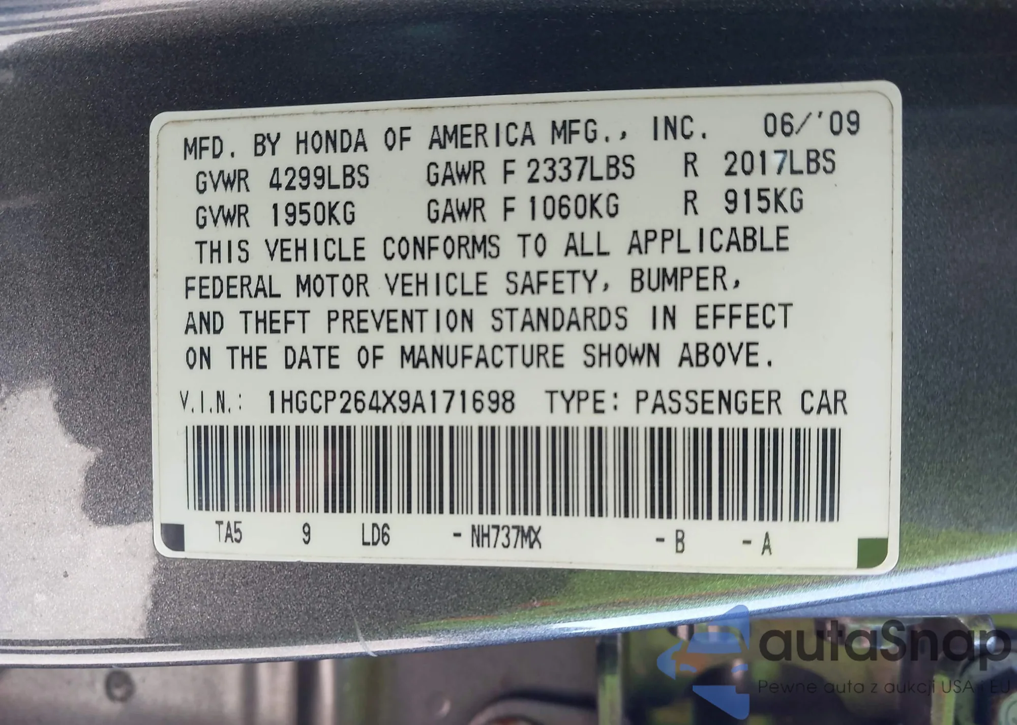 LOT: 44201427 VIN: 1HGCP264X9A171698