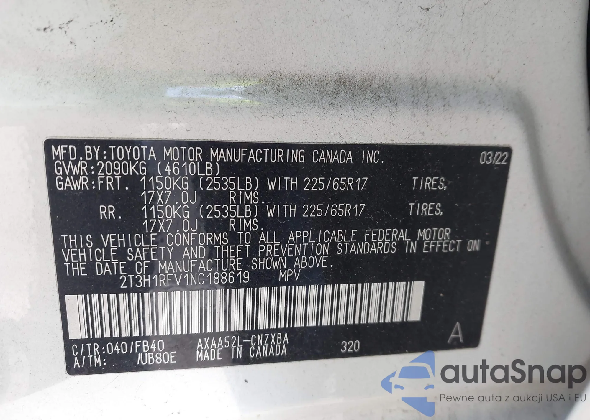 LOT: 43837176 VIN: 2T3H1RFV1NC188619
