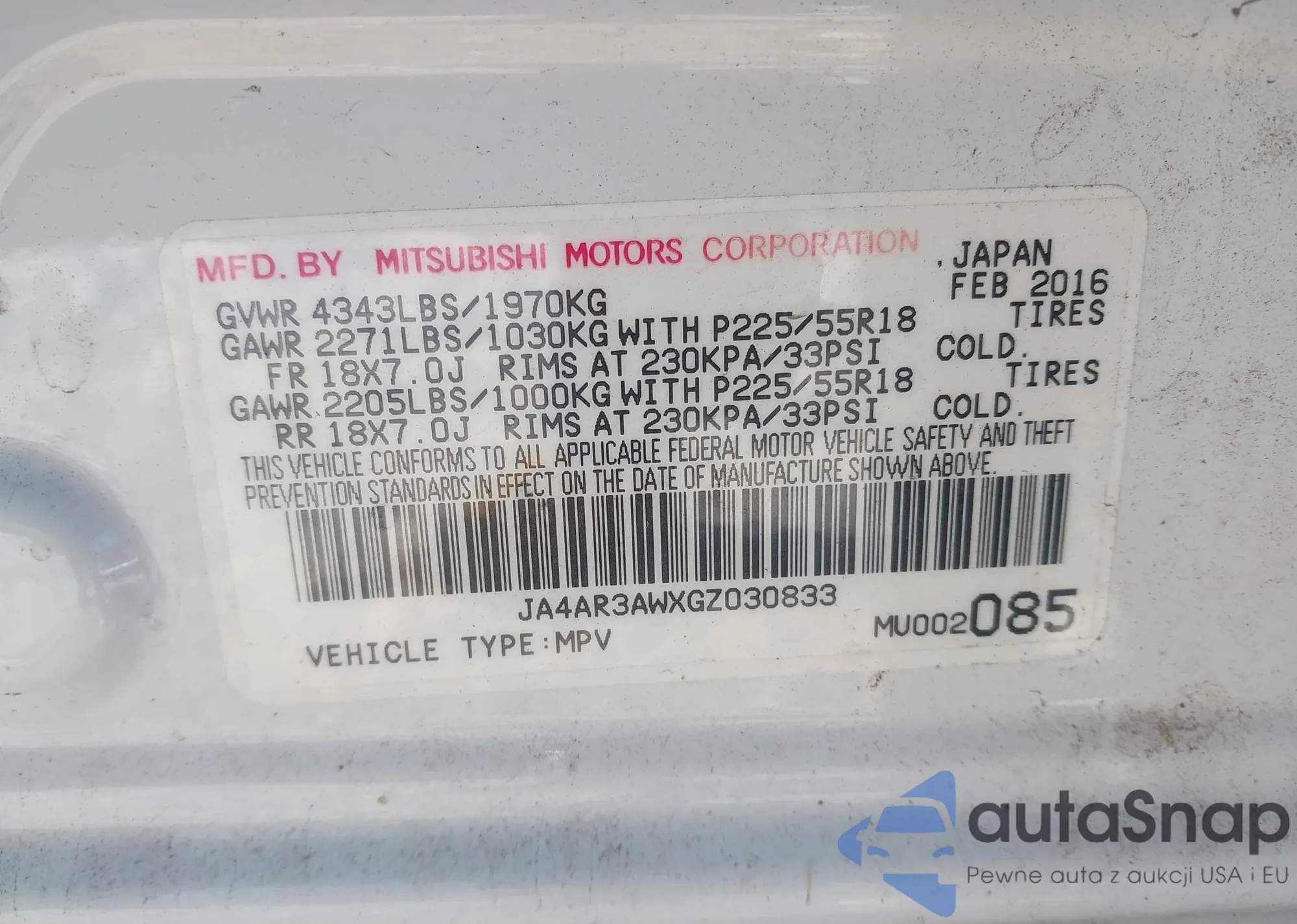 • VIN JA4AR3AWXGZ030833