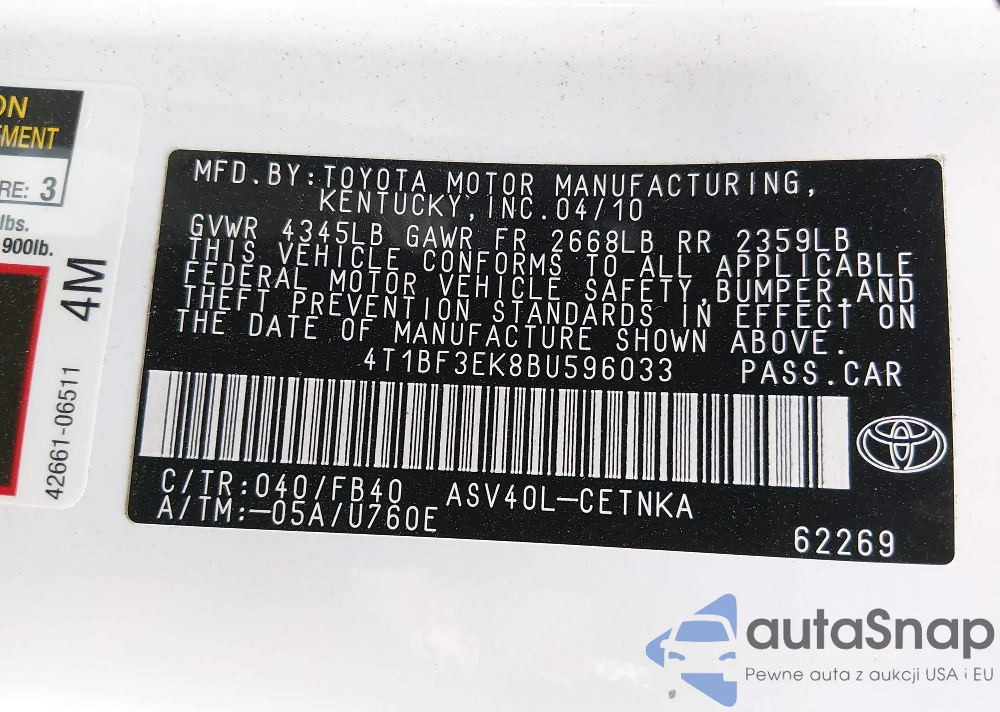 • VIN 4T1BF3EK8BU596033