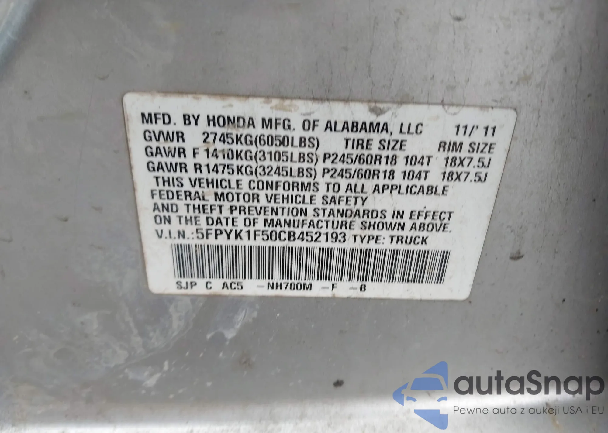 • VIN 5FPYK1F50CB452193