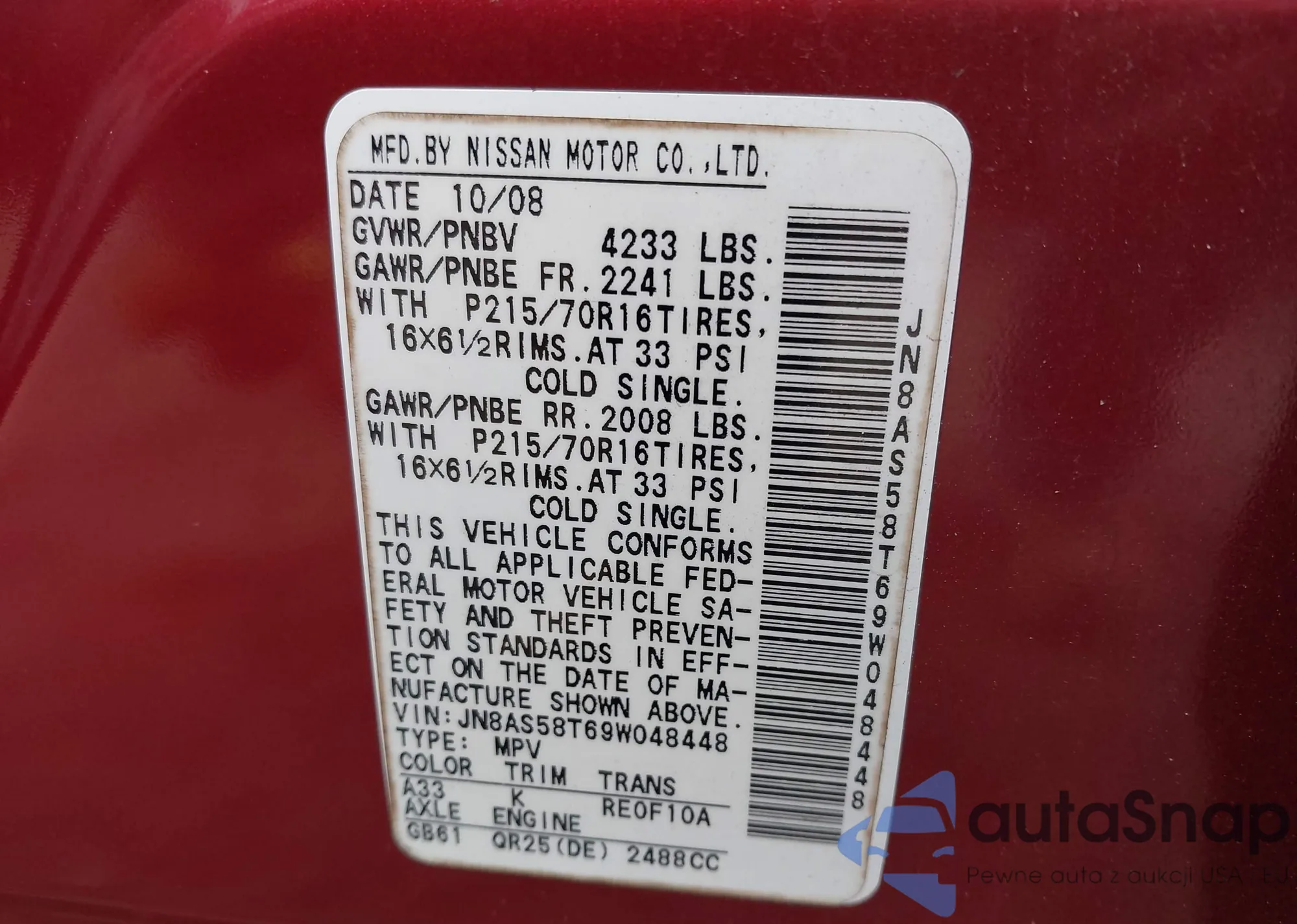 • VIN JN8AS58T69W048448