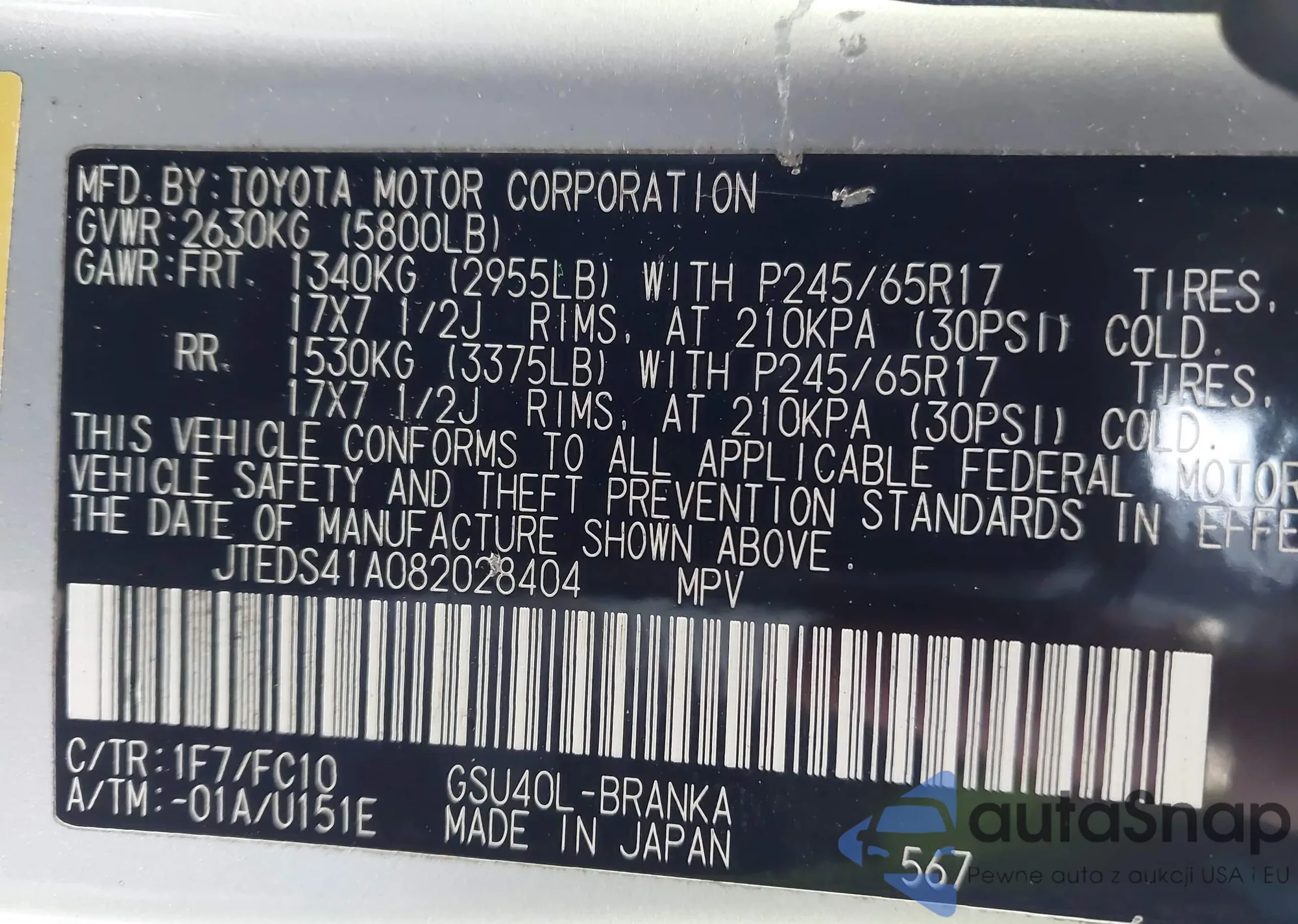 LOT: 44006931 VIN: JTEDS41A082028404
