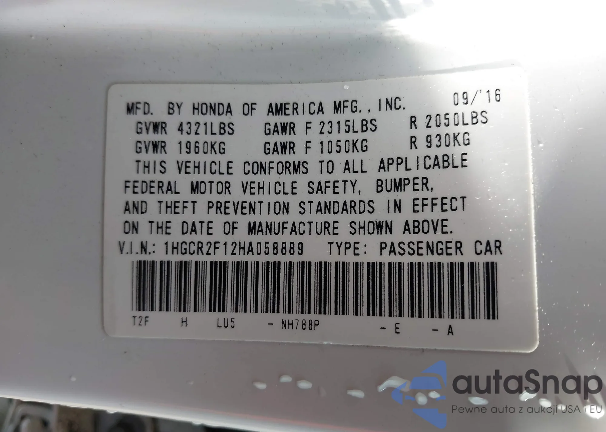 LOT: 43194056 VIN: 1HGCR2F12HA058889