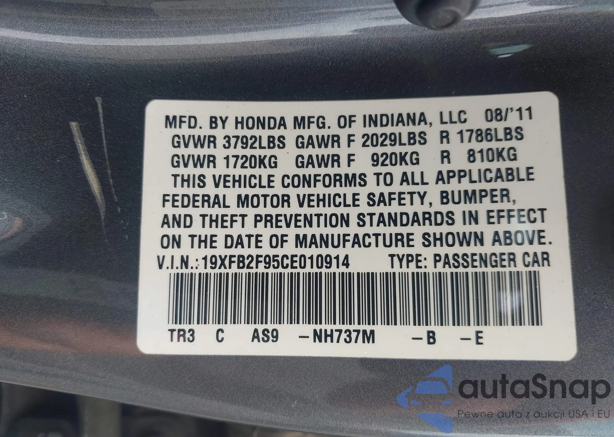 LOT: 43375906 VIN: 19XFB2F95CE010914