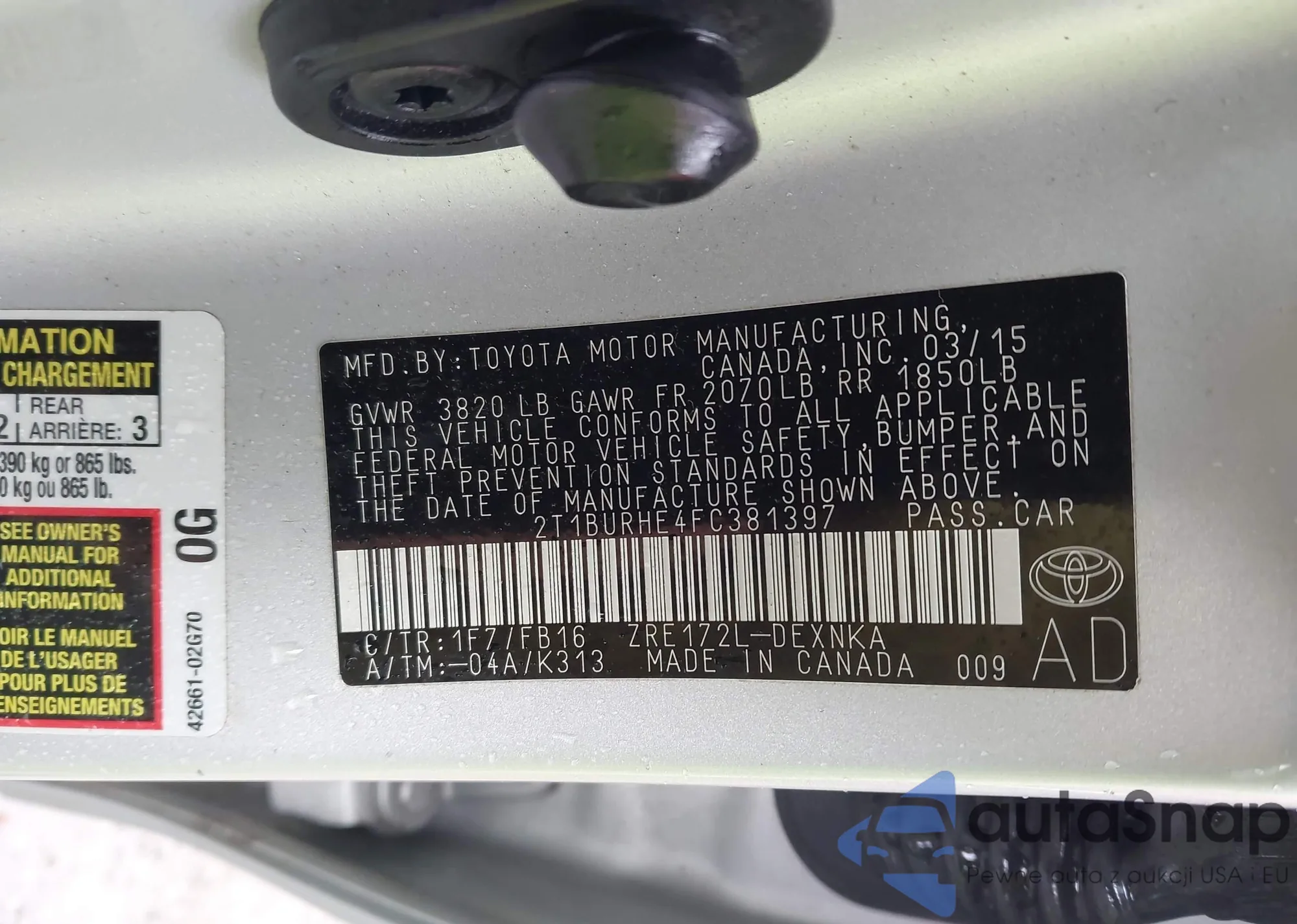 LOT: 43559142 VIN: 2T1BURHE4FC381139