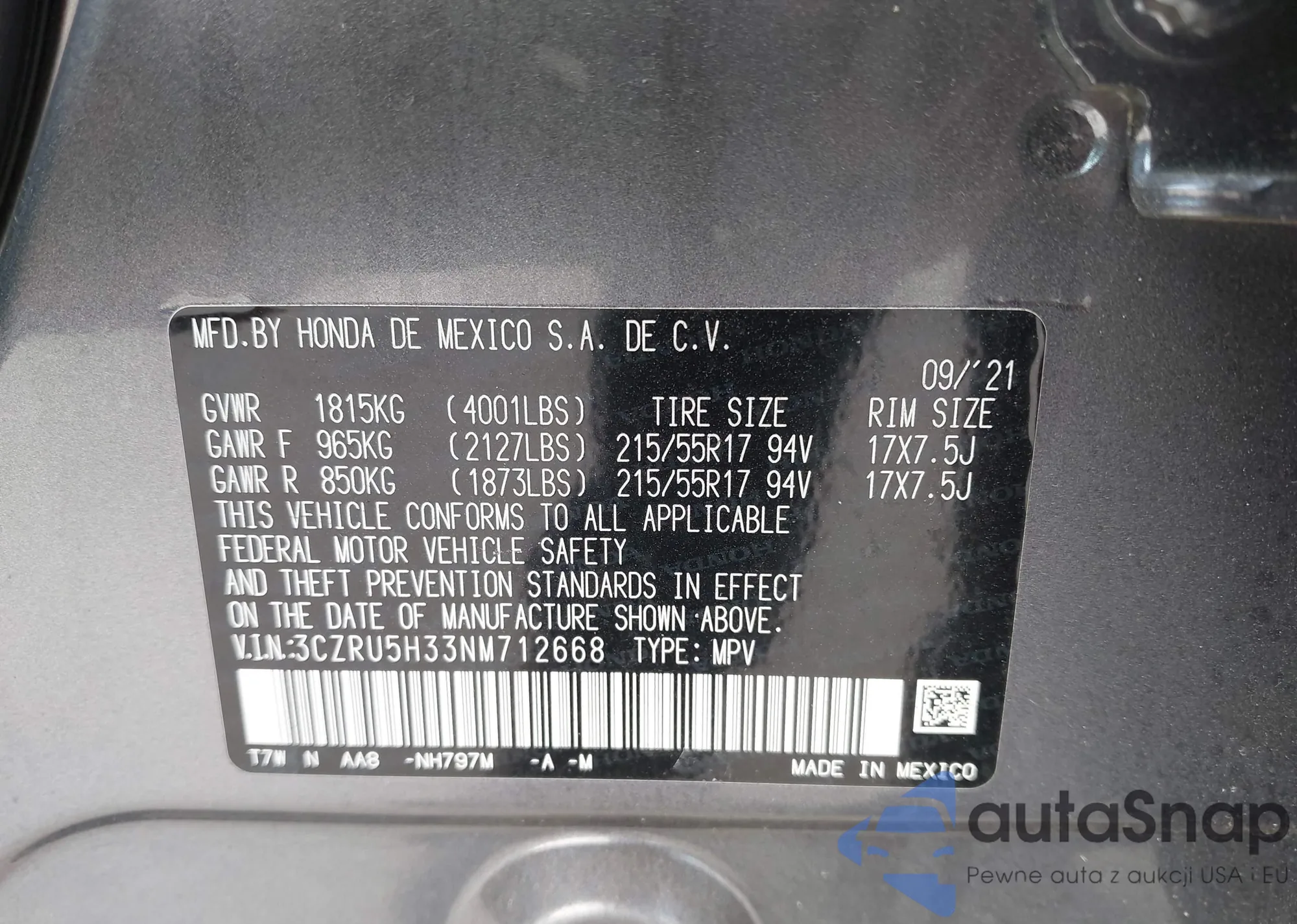 • VIN 3CZRU5H33NM712668
