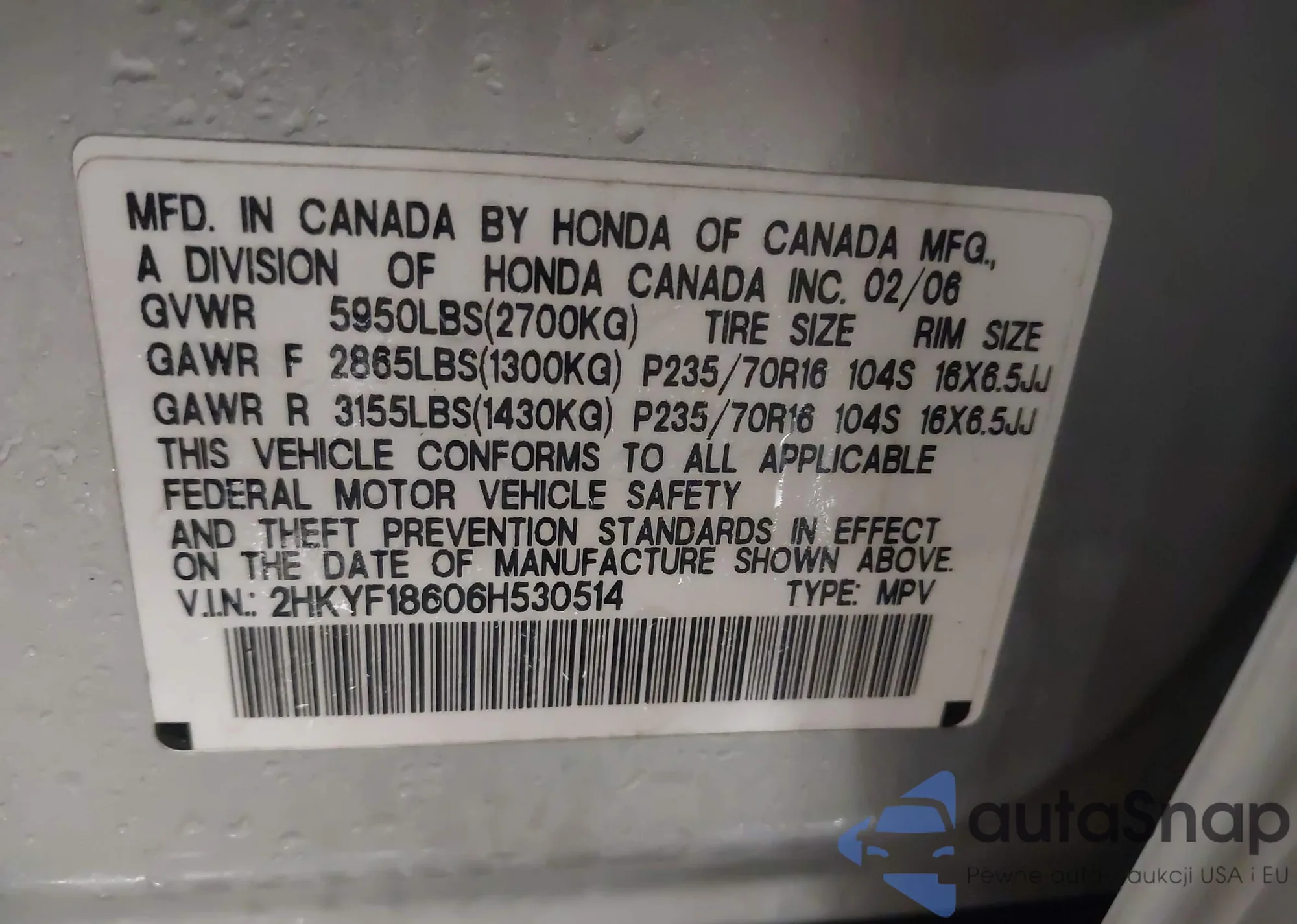 • VIN 2HKYF18606H530514