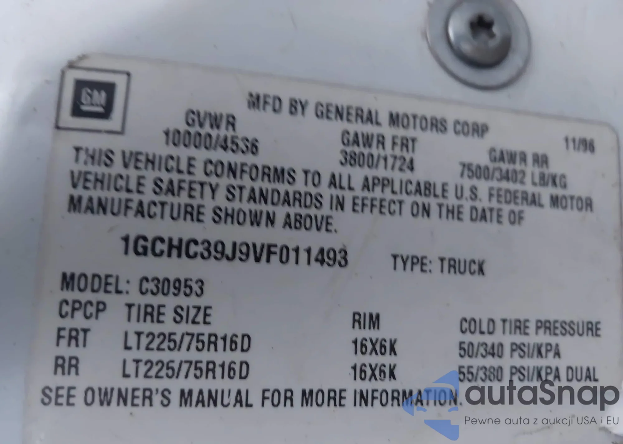 • VIN 1GCHC39J9VF011493