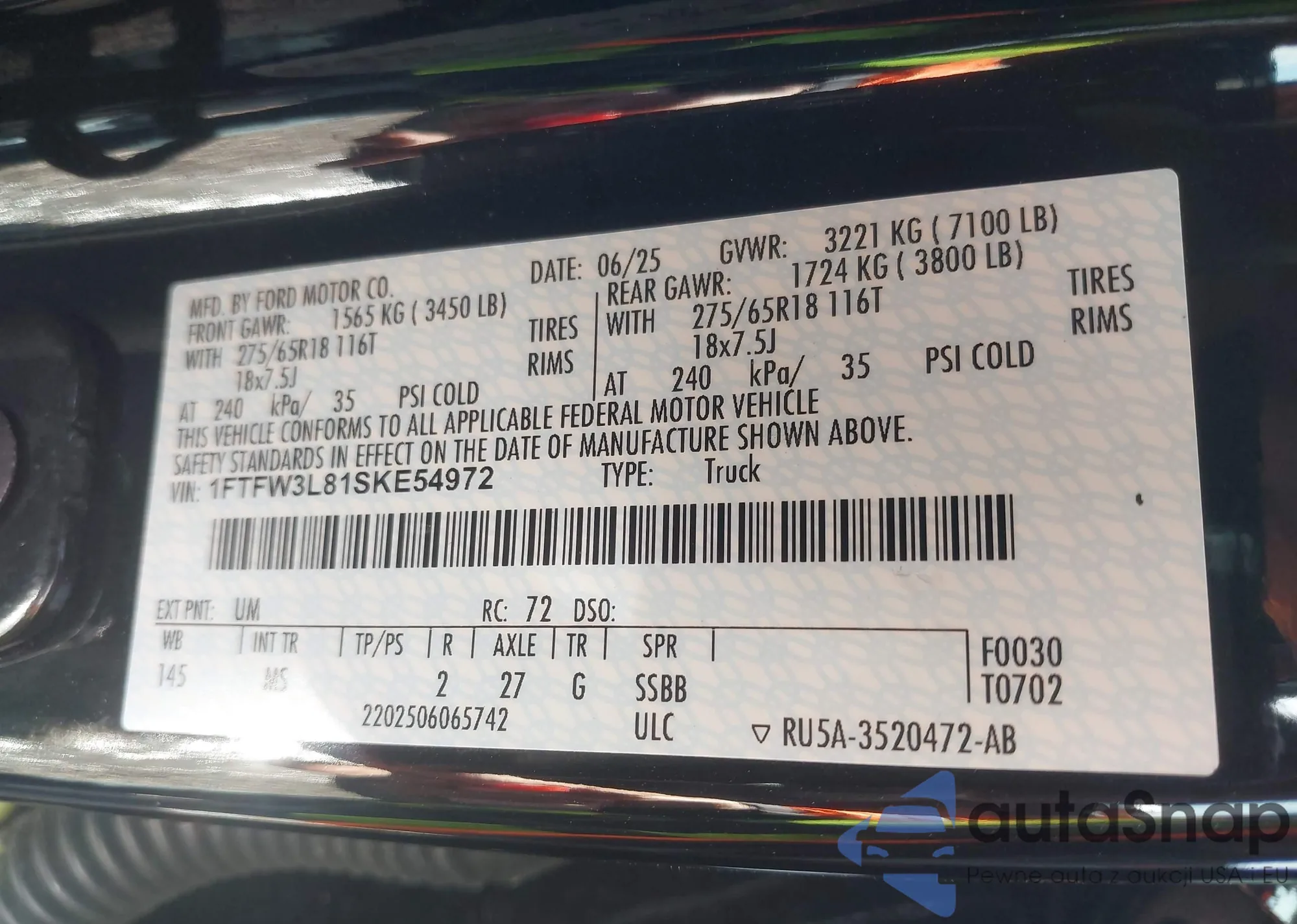 LOT: 44200953 VIN: 1FTFW3L81SKE54972