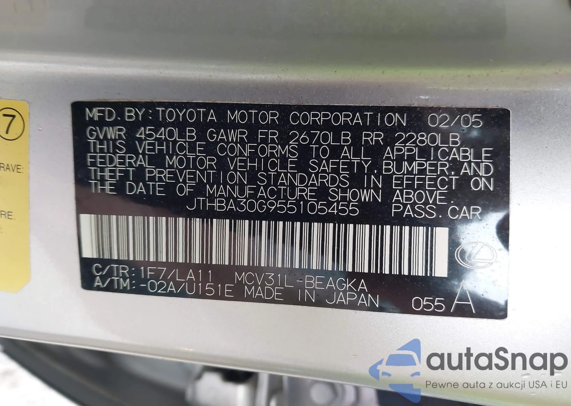 LOT: 44117939 VIN: JTHBA30G955105455