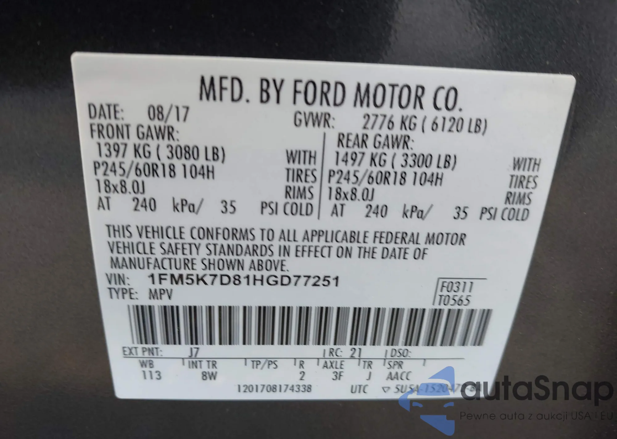 LOT: 43921344 VIN: 1FM5K7D81HGD77251