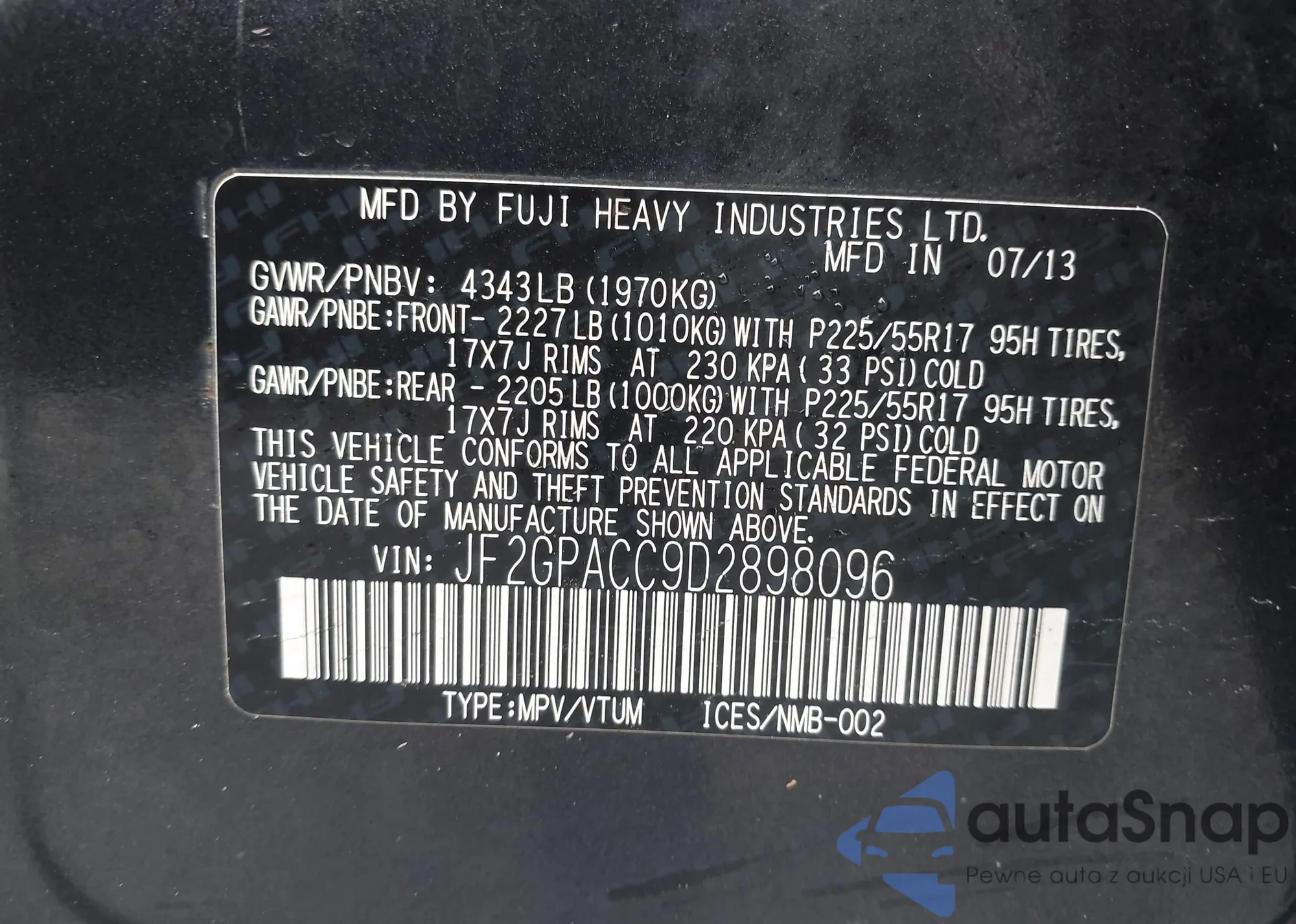 LOT: 43785919 VIN: JF2GPACC9D2898096