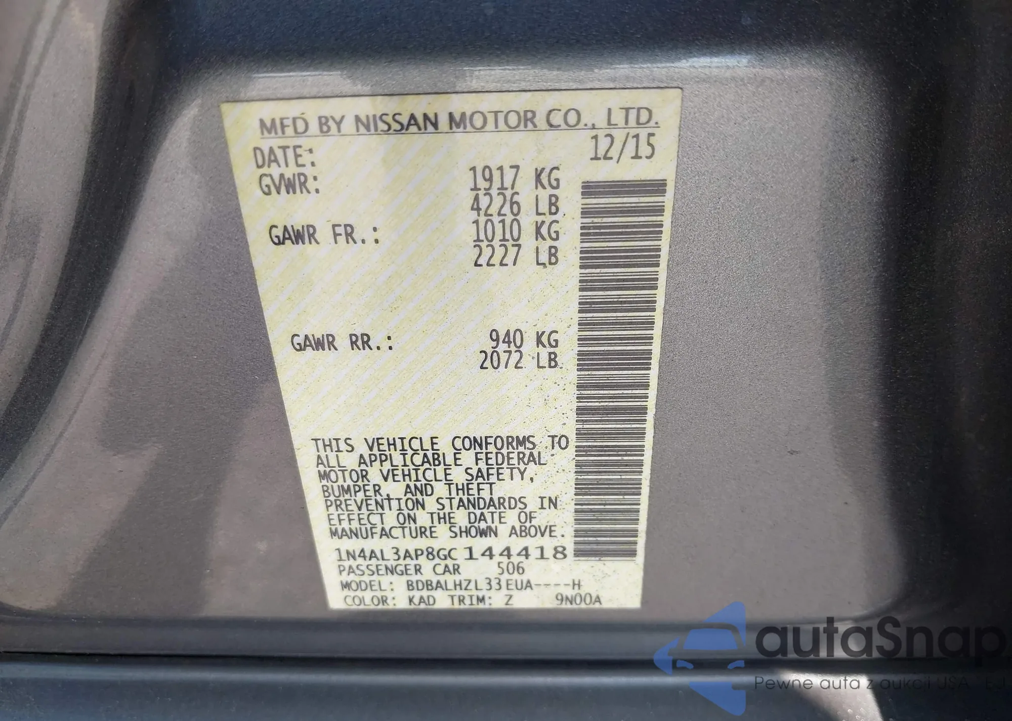 • VIN 1N4AL3AP8GC144418