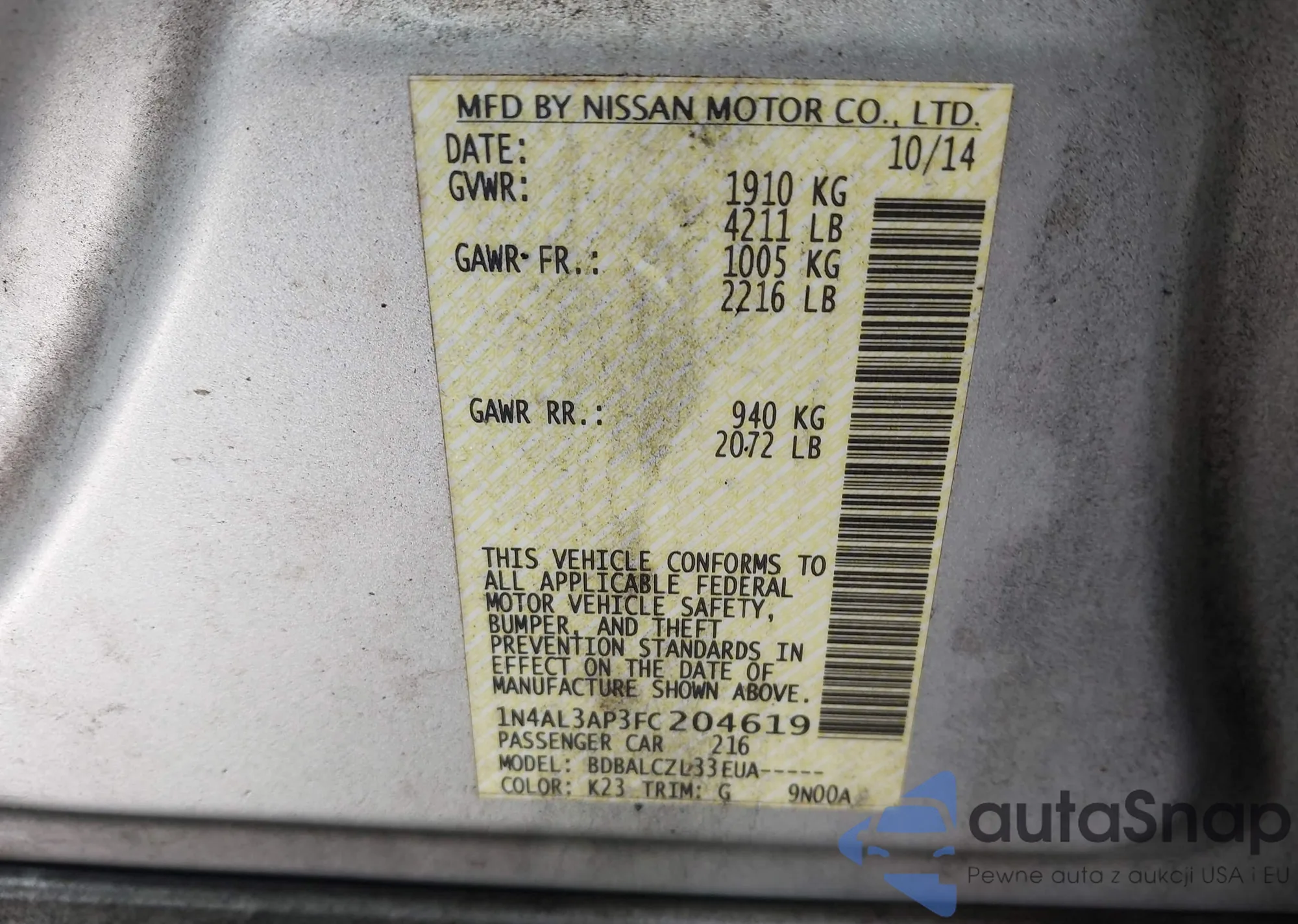 LOT: 44049782 VIN: 1N4AL3AP3FC204619