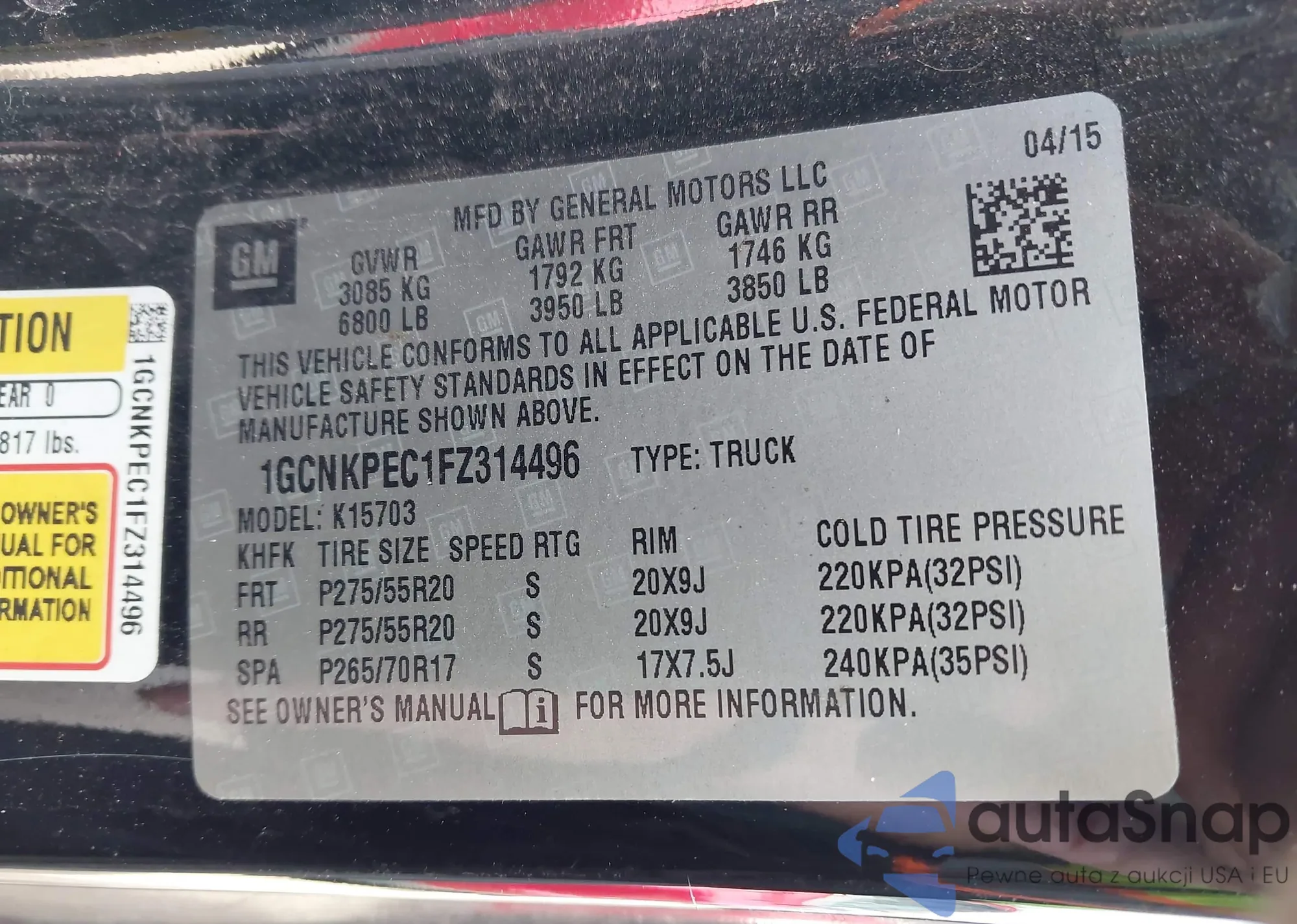 • VIN 1GCNKPEC1FZ314496