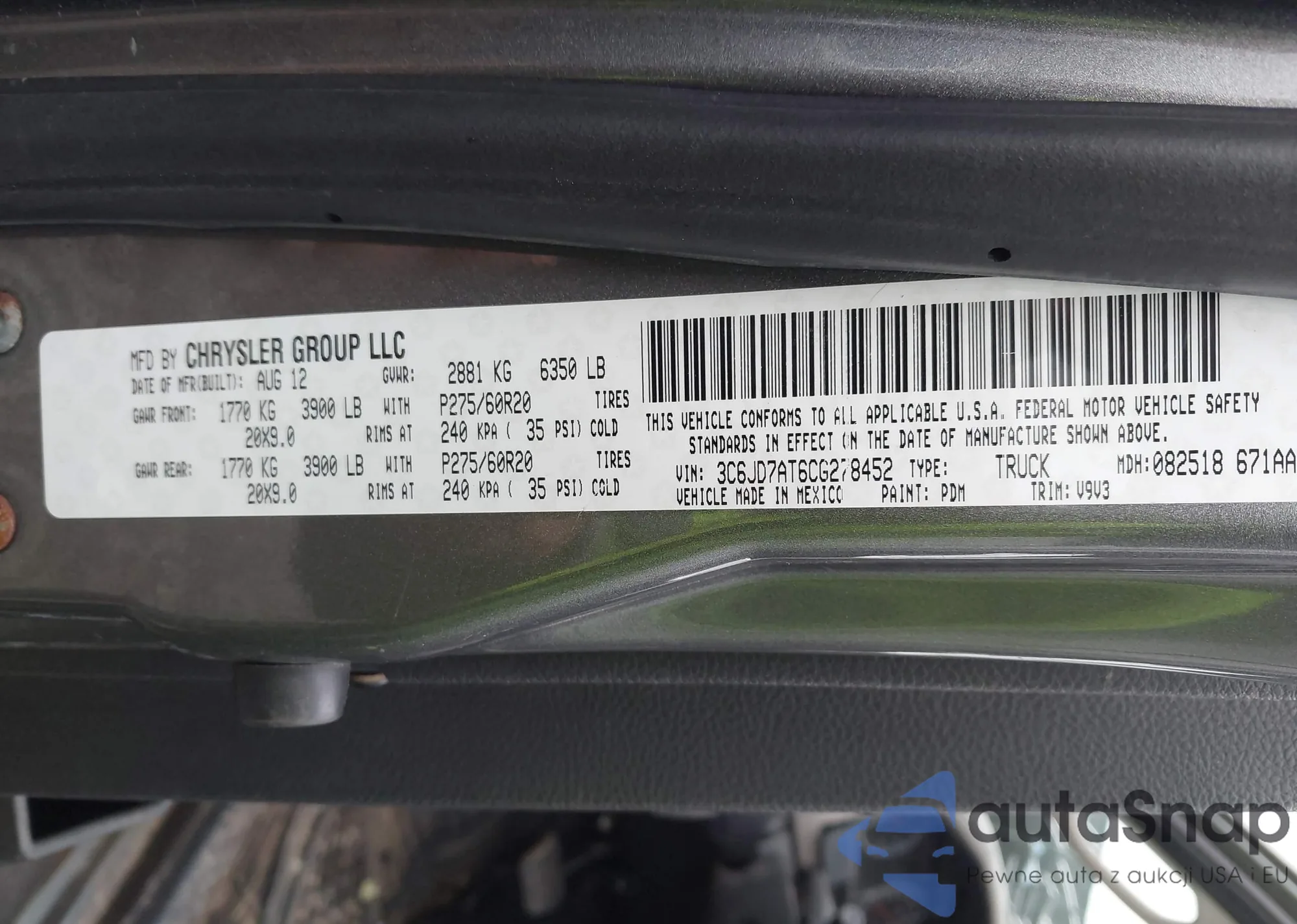 • VIN 3C6JD7AT6CG278452