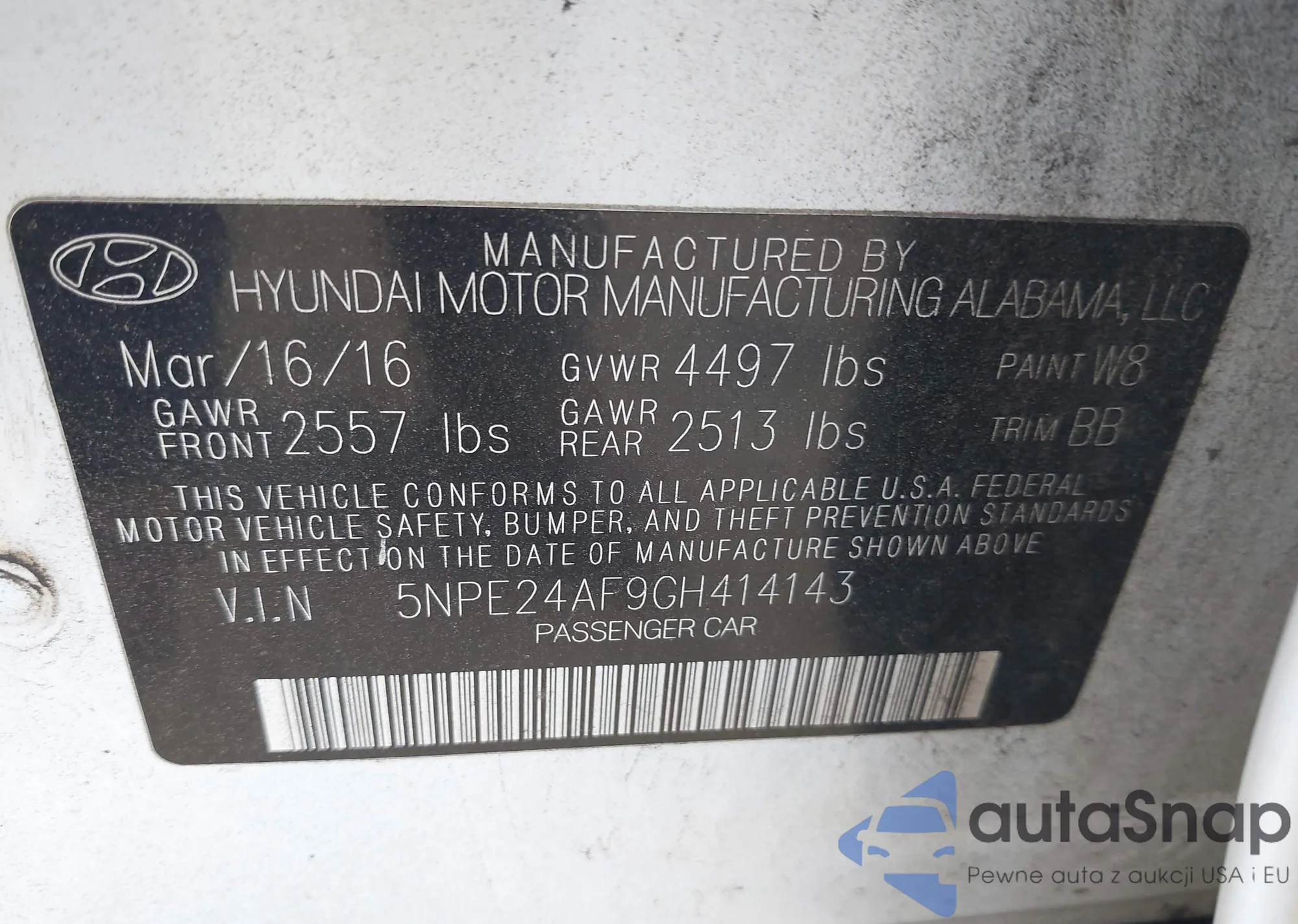 LOT: 43996926 VIN: 5NPE24AF9GH414143