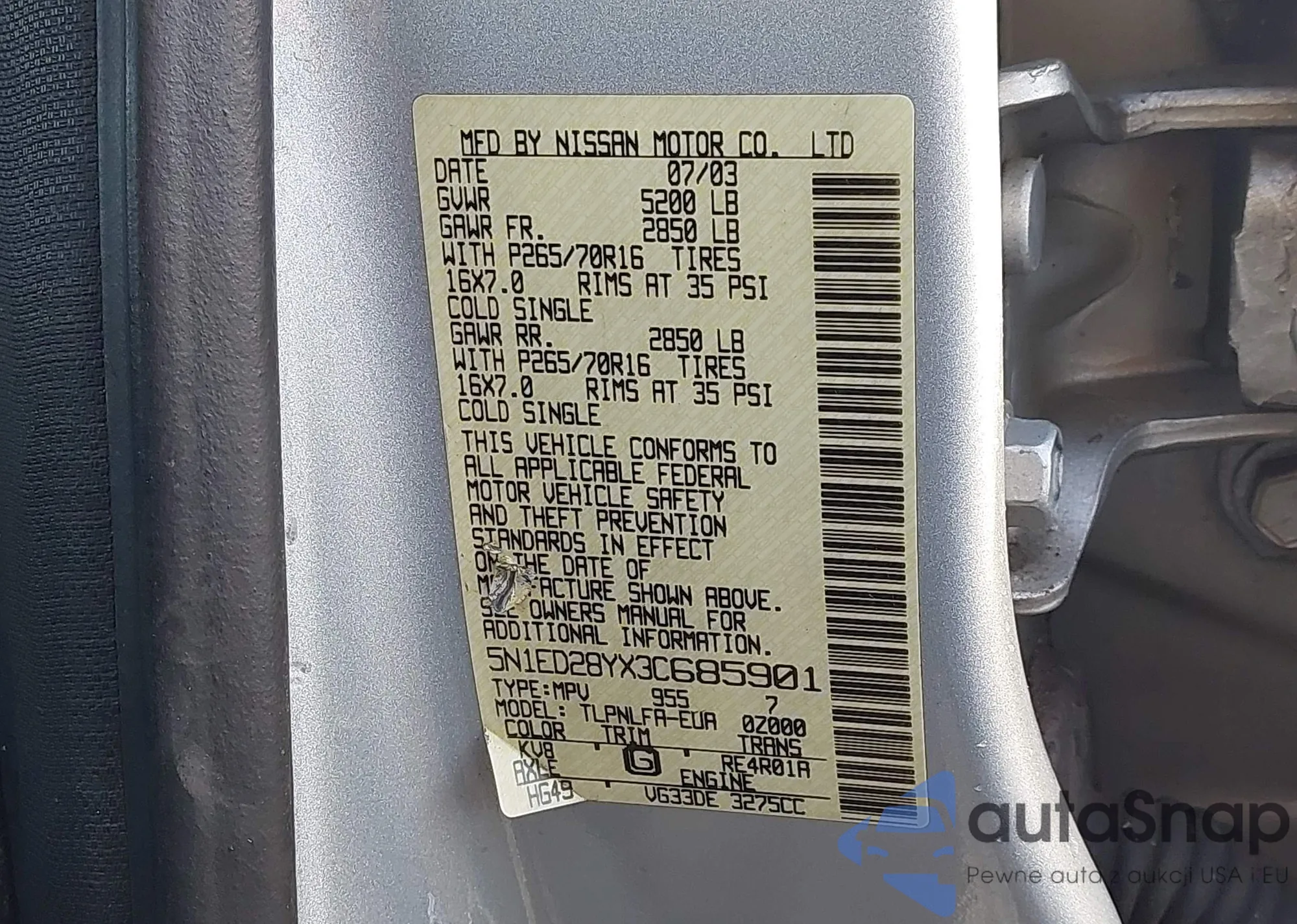 • VIN 5N1ED28YX3C685901