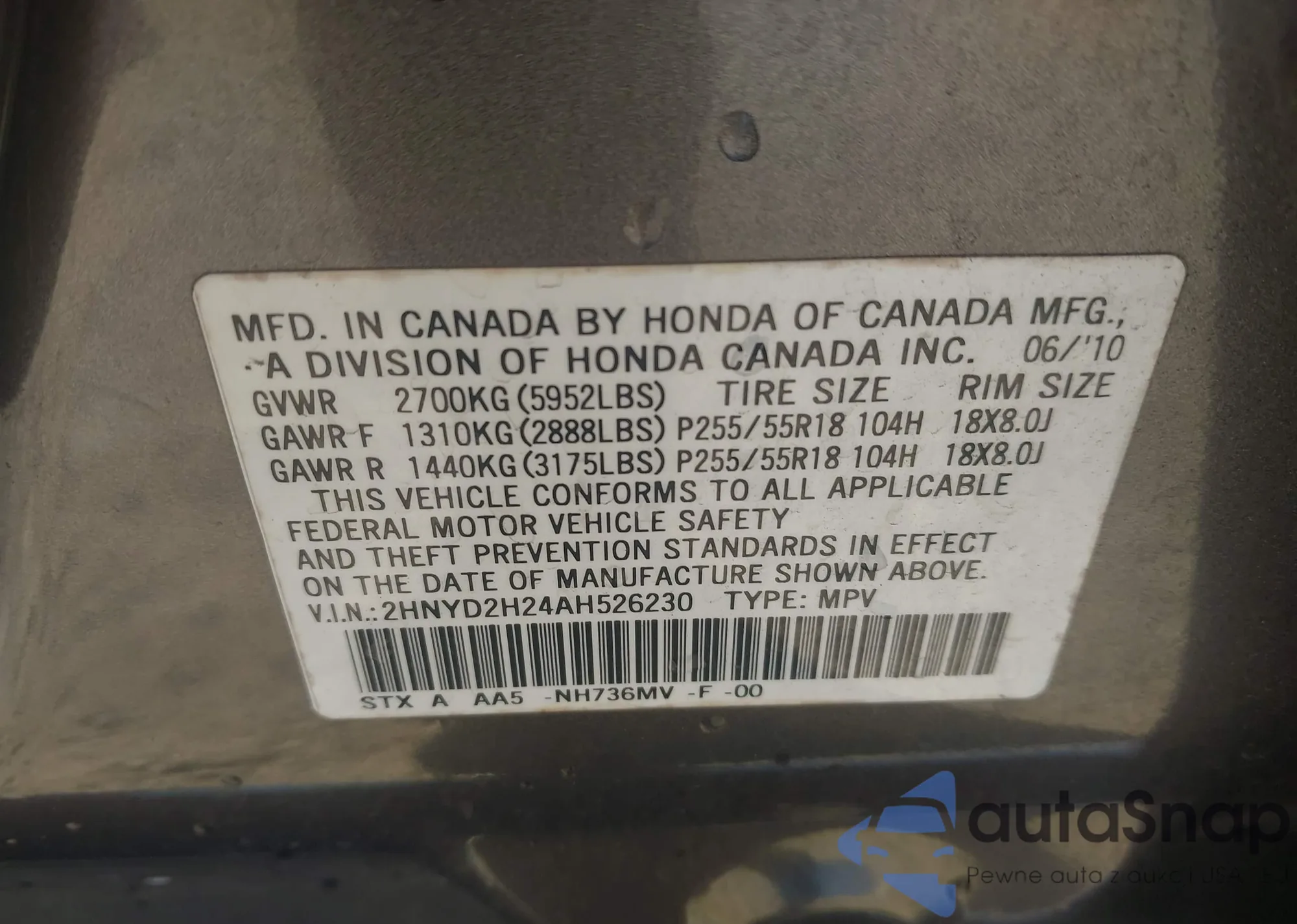 • VIN 2HNYD2H24AH526230