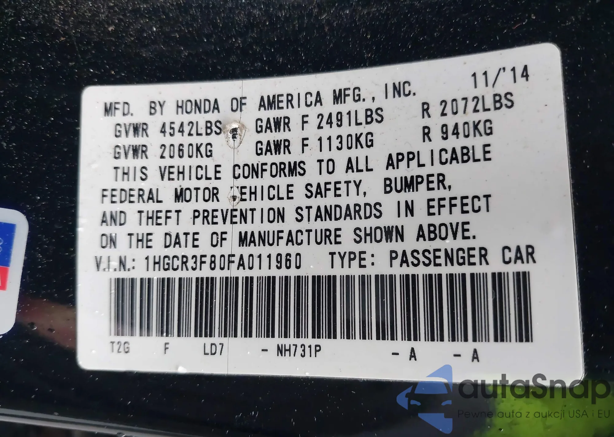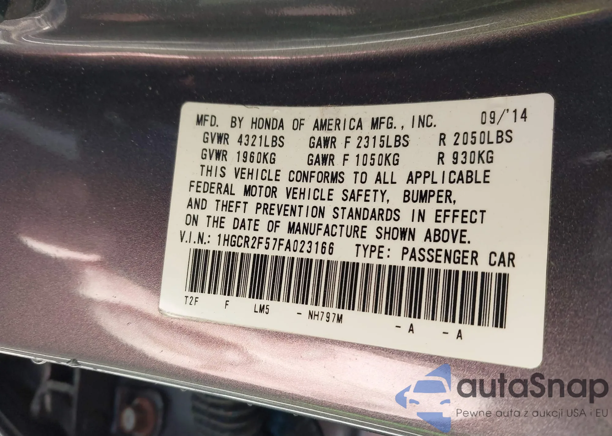 LOT: 44037807 VIN: 1HGCR2F57FA023166