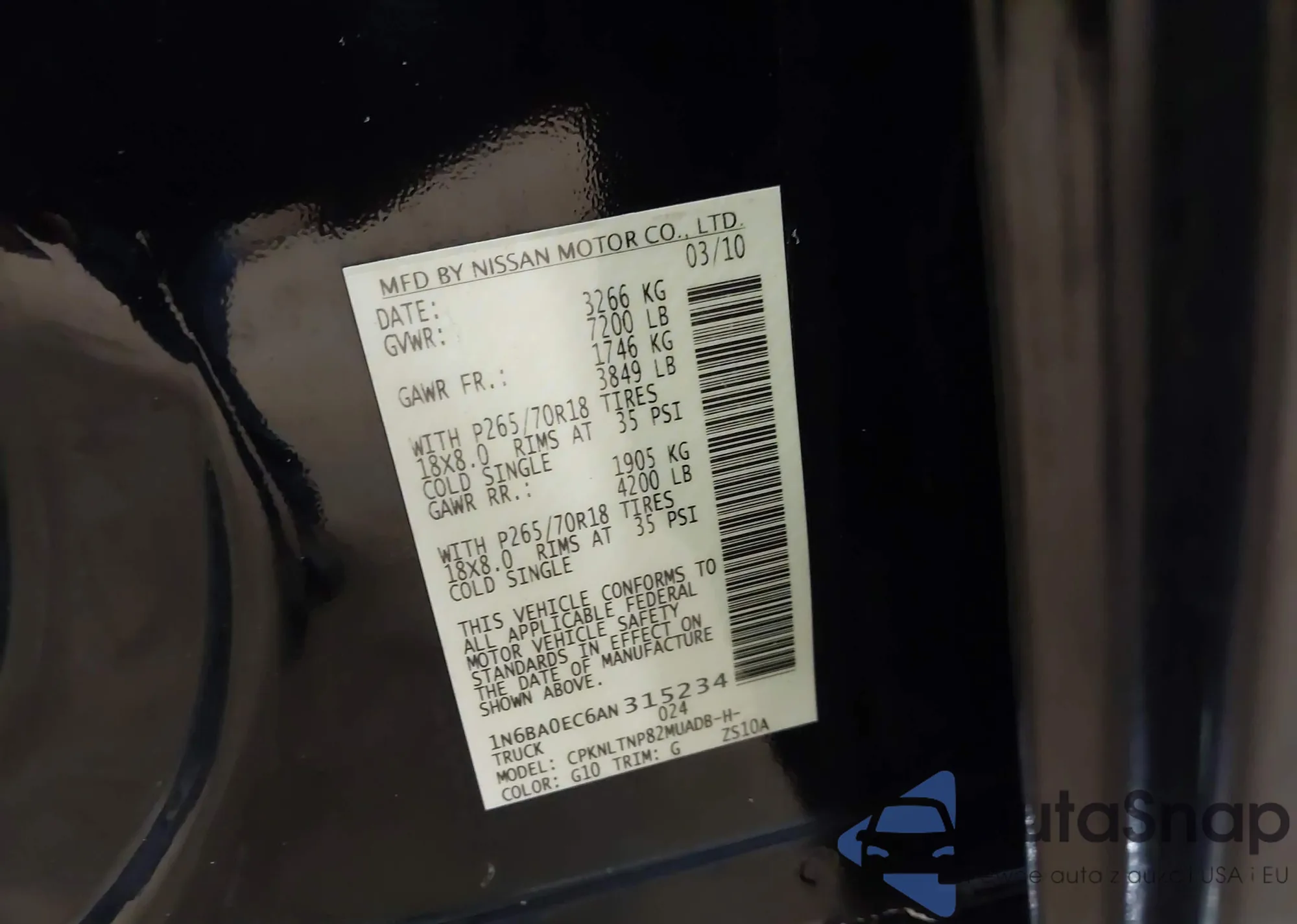 LOT: 43638357 VIN: 1N6BA0EC6AN315234