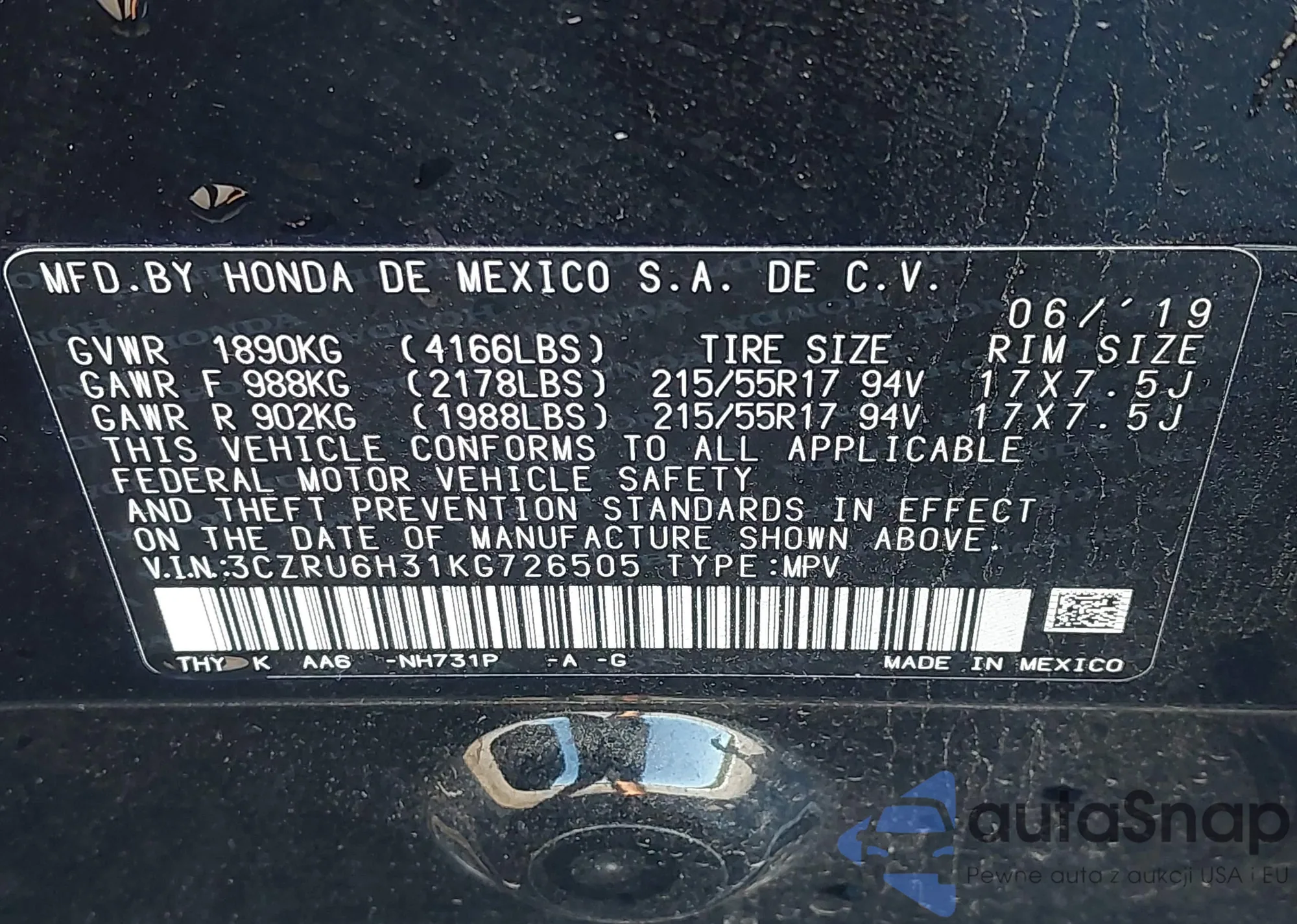 • VIN 3CZRU6H31KG726505
