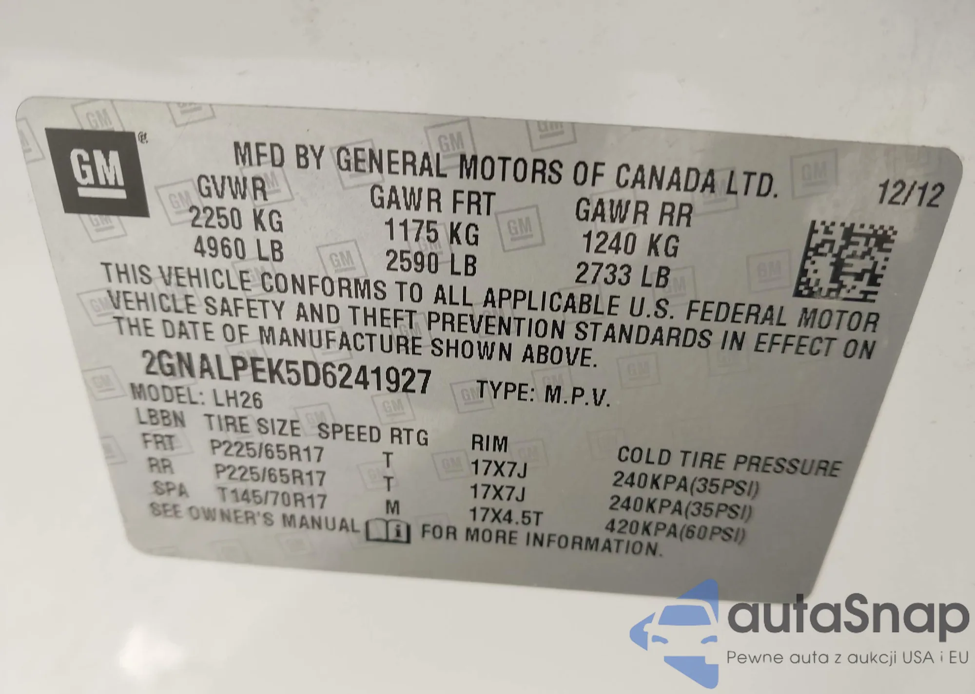 LOT: 43411009 VIN: 2GNALPEK5D6241927