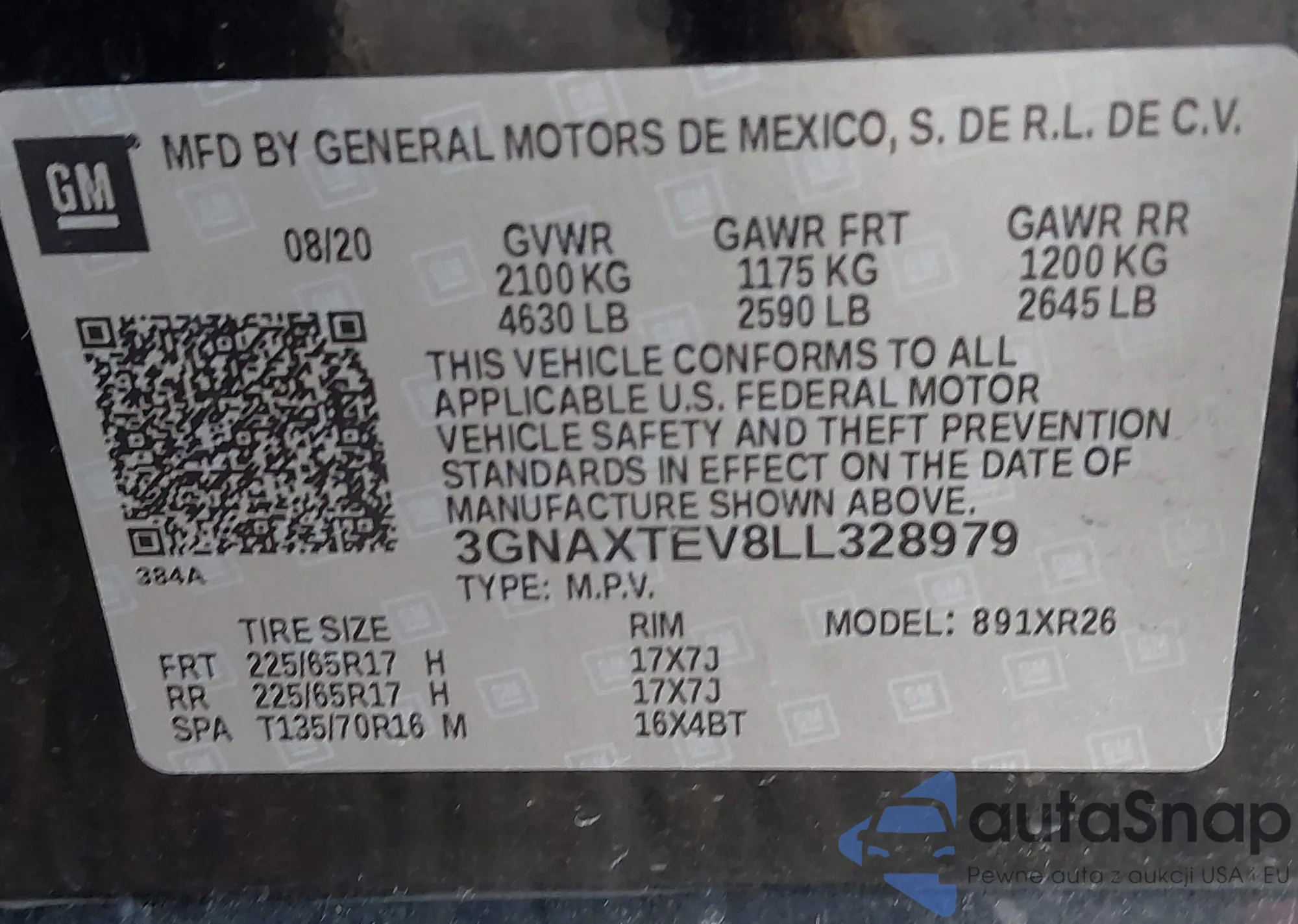 LOT: 43471459 VIN: 3GNAXTEV8LL328979