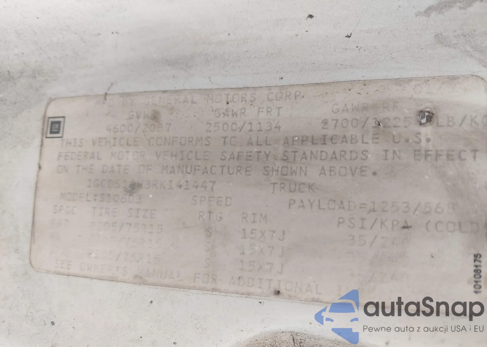 • VIN 1GCCS14W3RK141447