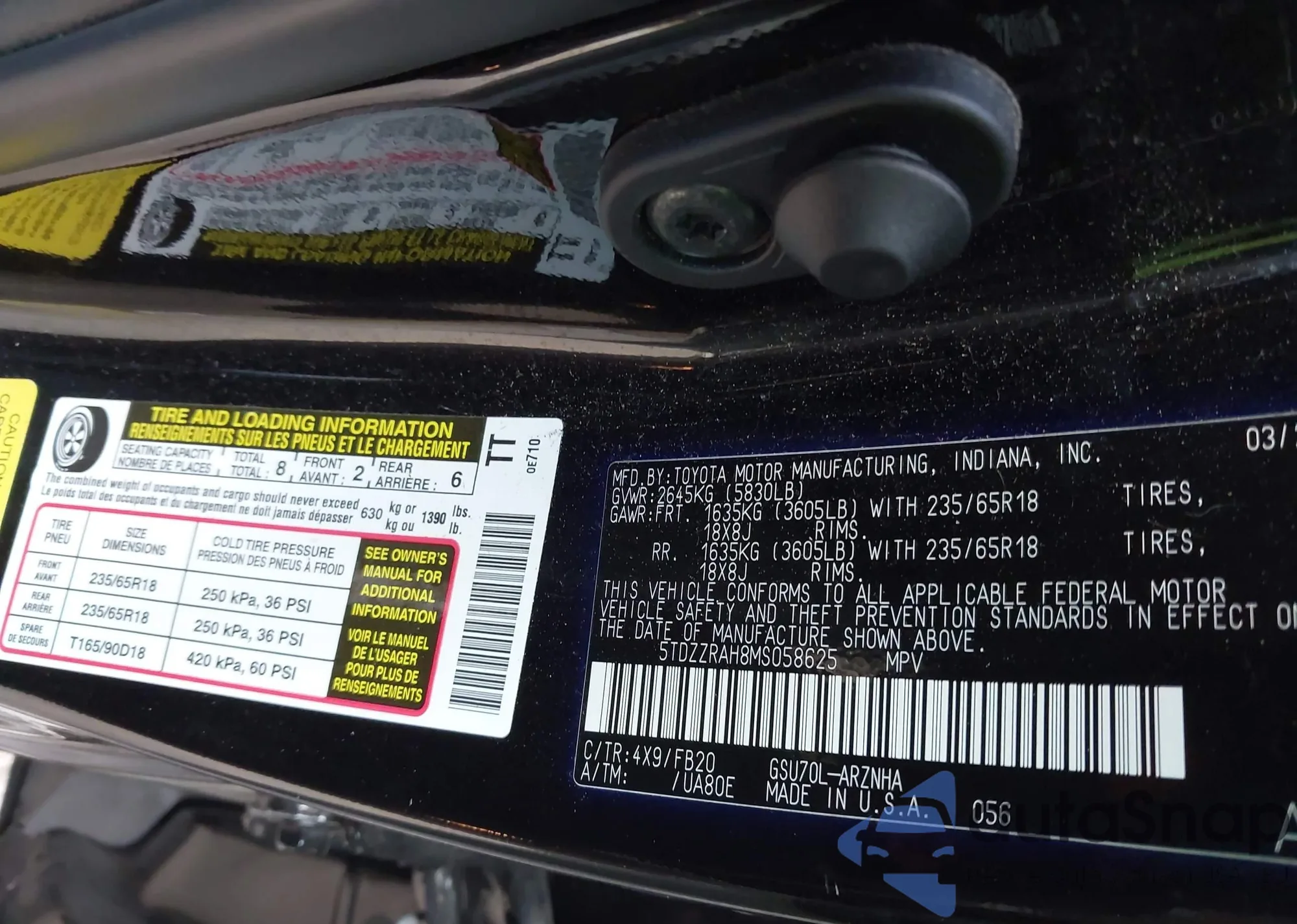 LOT: 43995786 VIN: 5TDZZRAH8MS058625