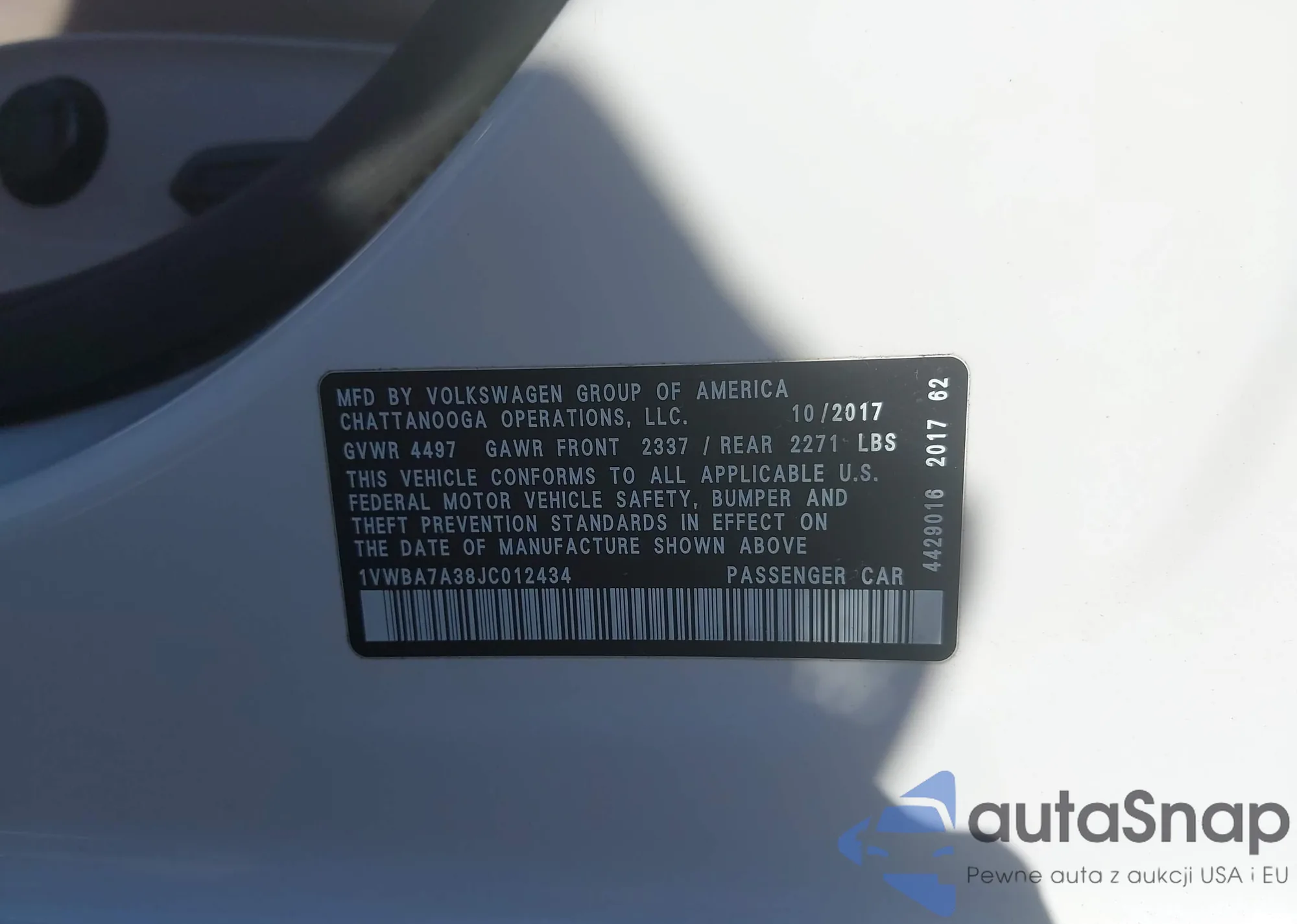 LOT: 43706339 VIN: 1VWBA7A38JC012434