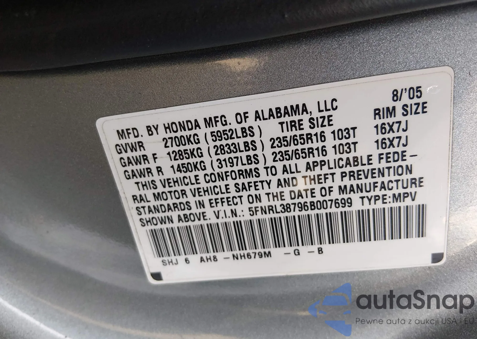 • VIN 5FNRL38796B007699