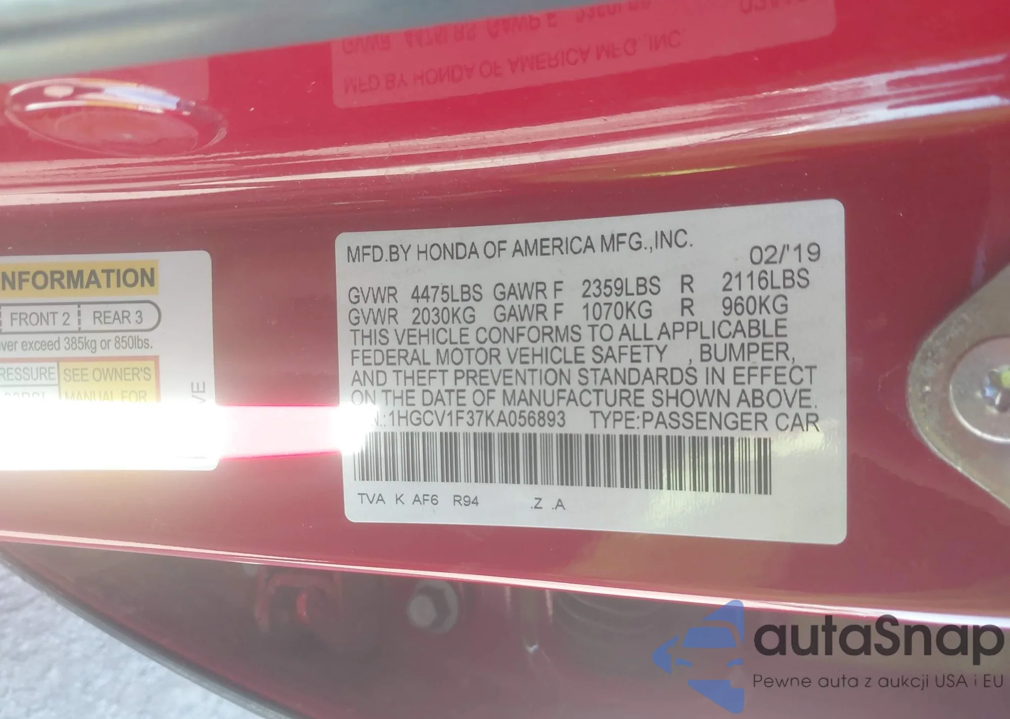 • VIN 1HGCV1F37KA056893