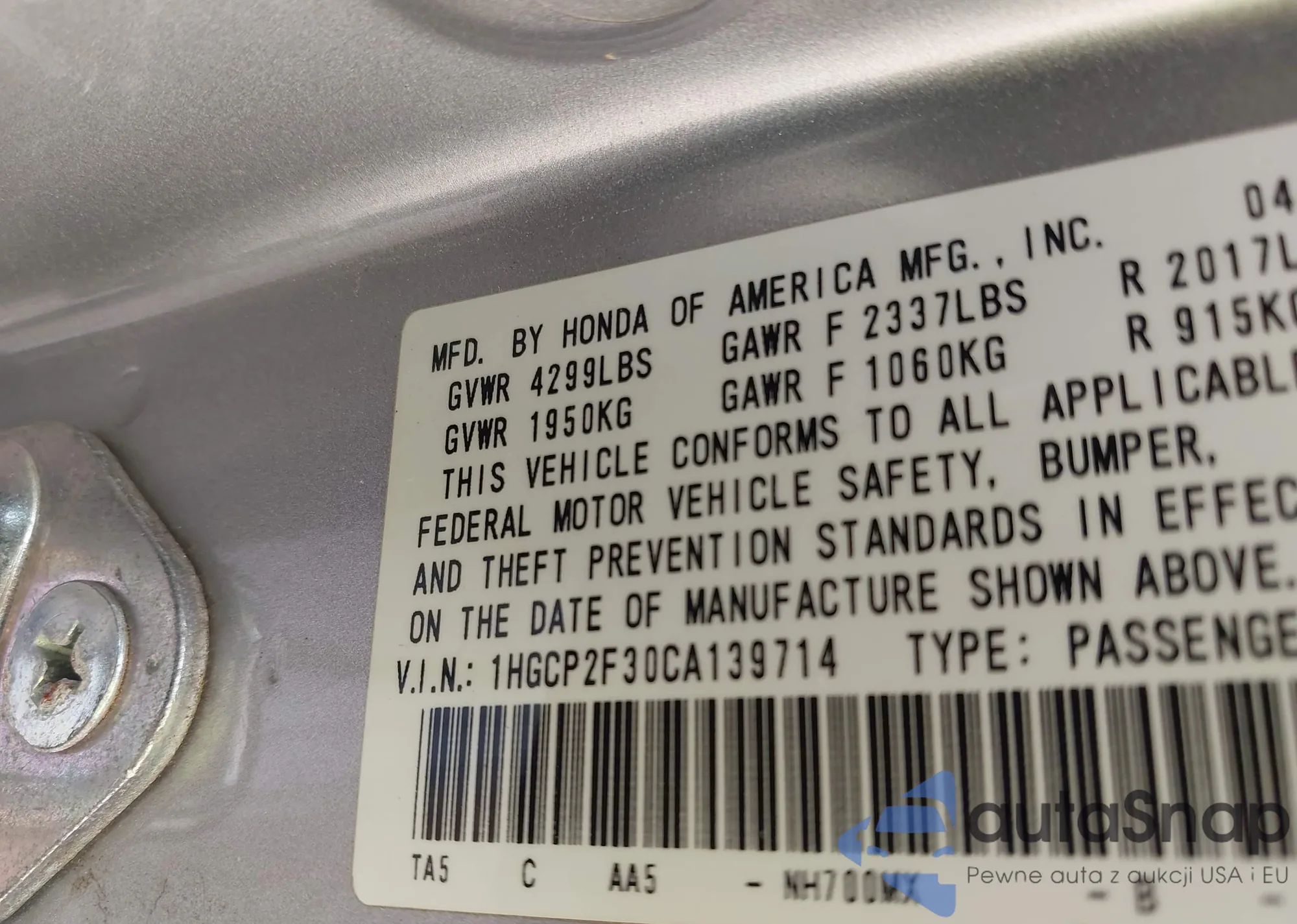 LOT: 43315400 VIN: 1HGCP2F30CA139714