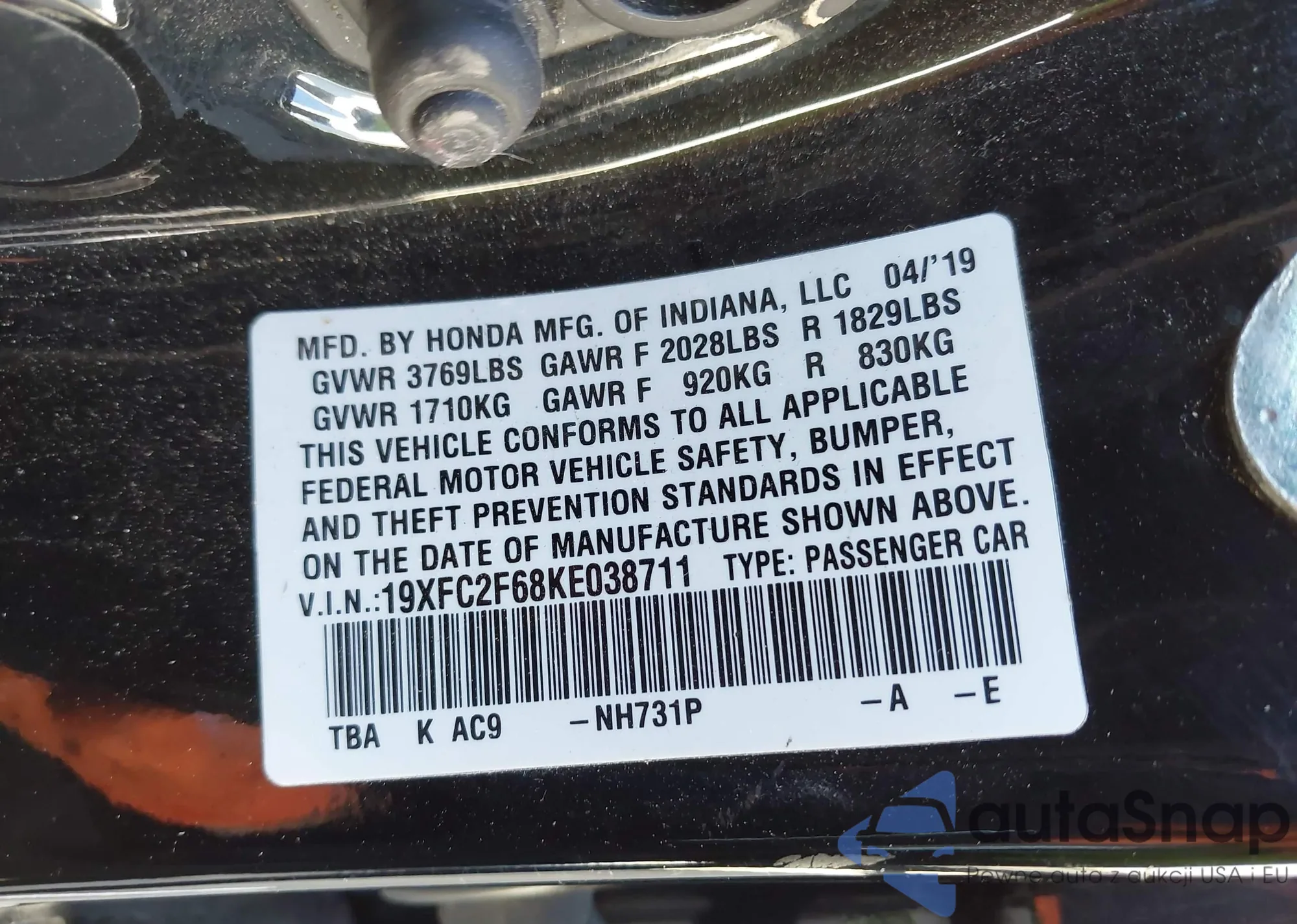 • VIN 19XFC2F68KE038711