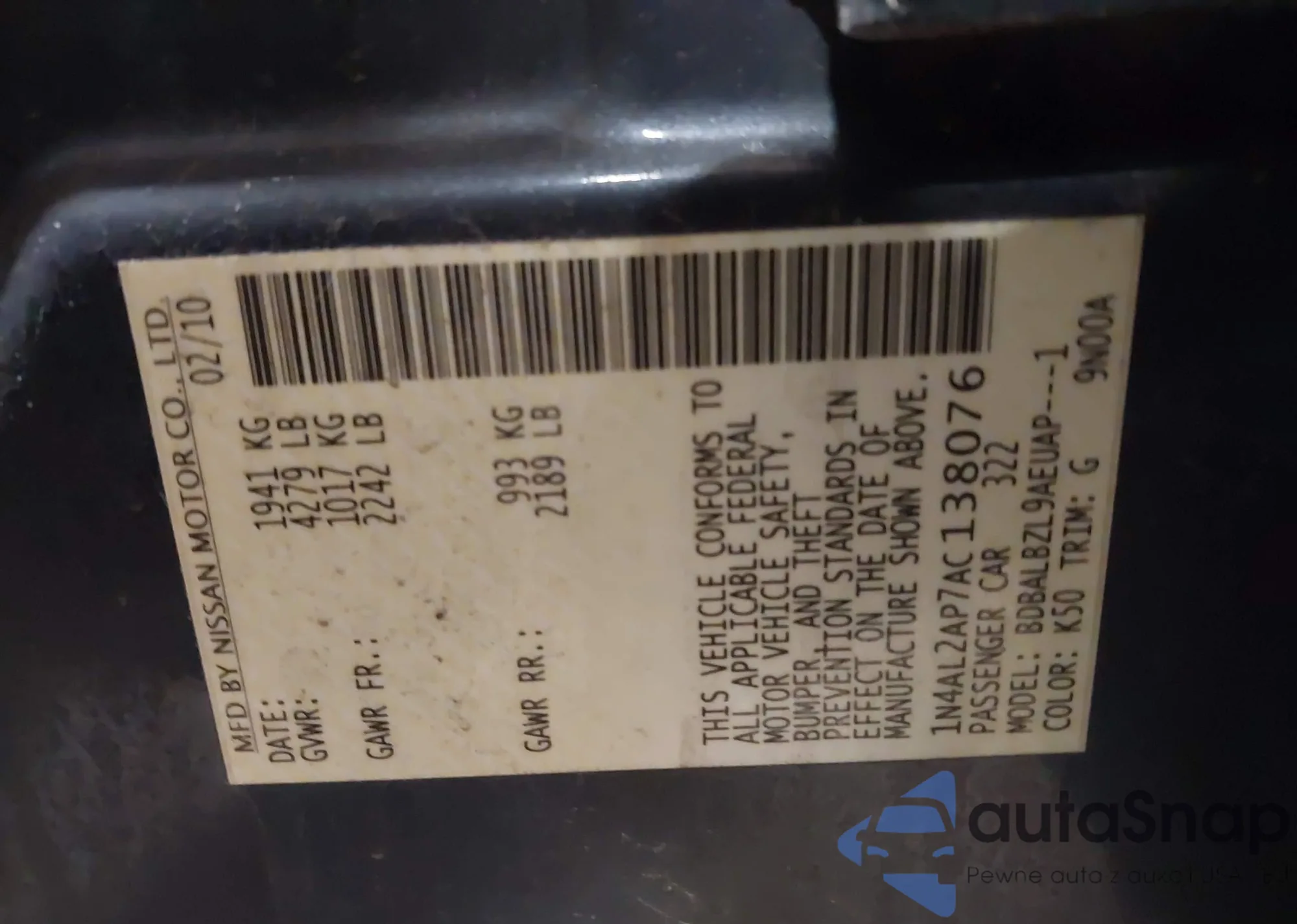 • VIN 1N4AL2AP7AC138076