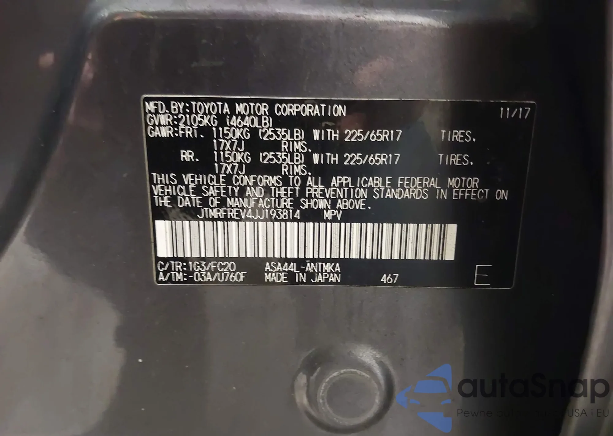 LOT: 44181968 VIN: JTMRFREV4JJ193814