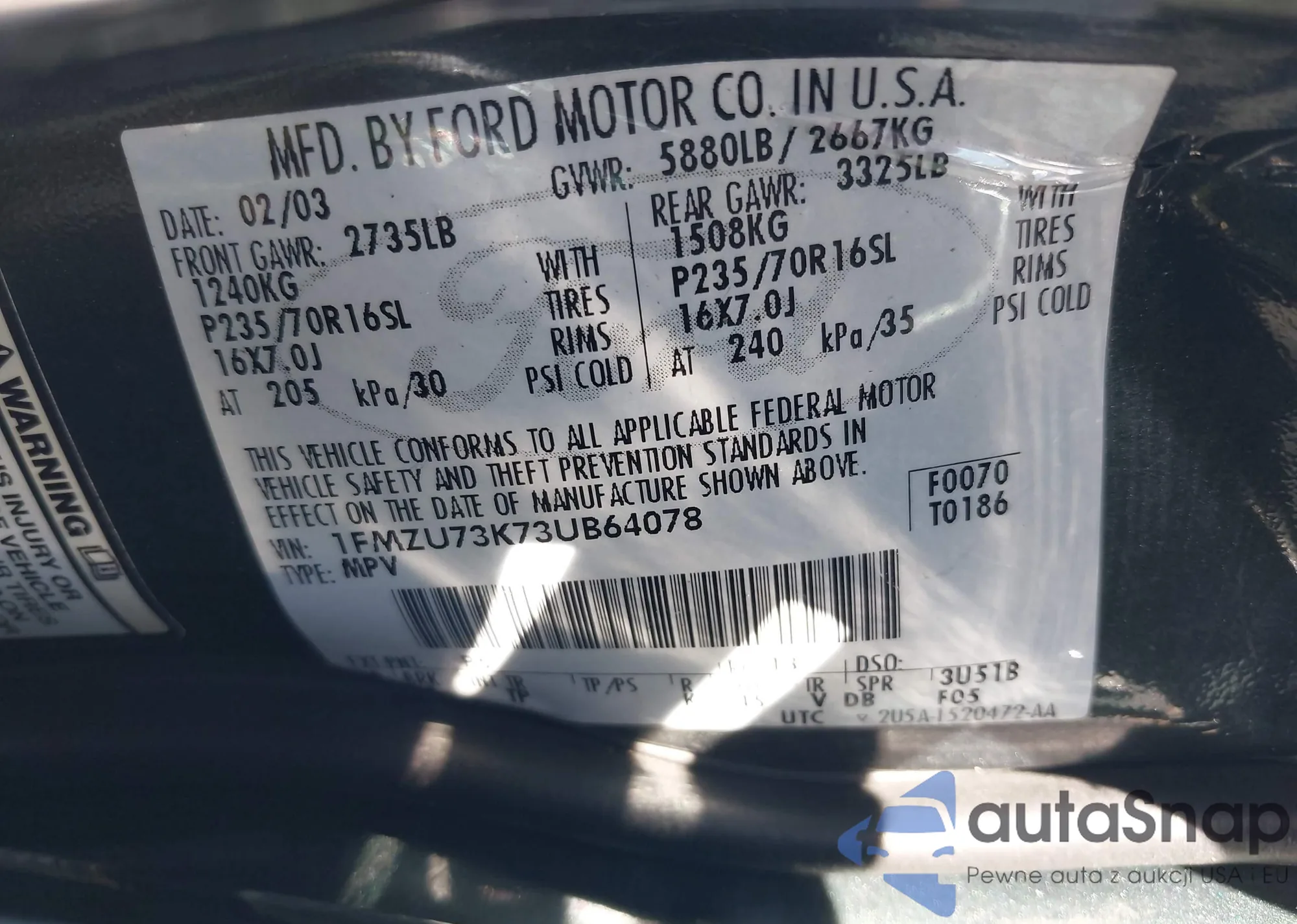 • VIN 1FMZU73K73UB64078