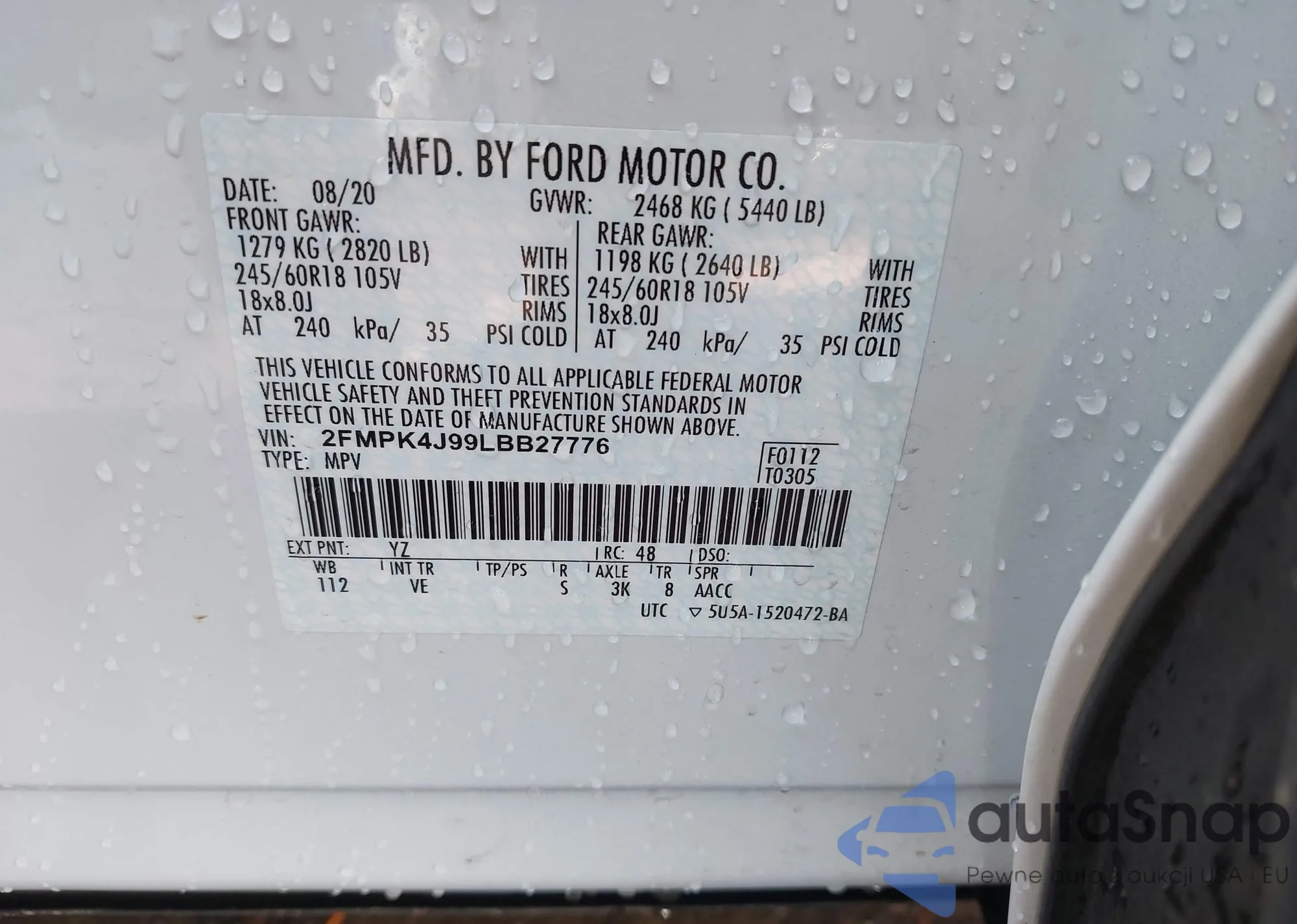 LOT: 43959772 VIN: 2FMPK4J99LBB27776