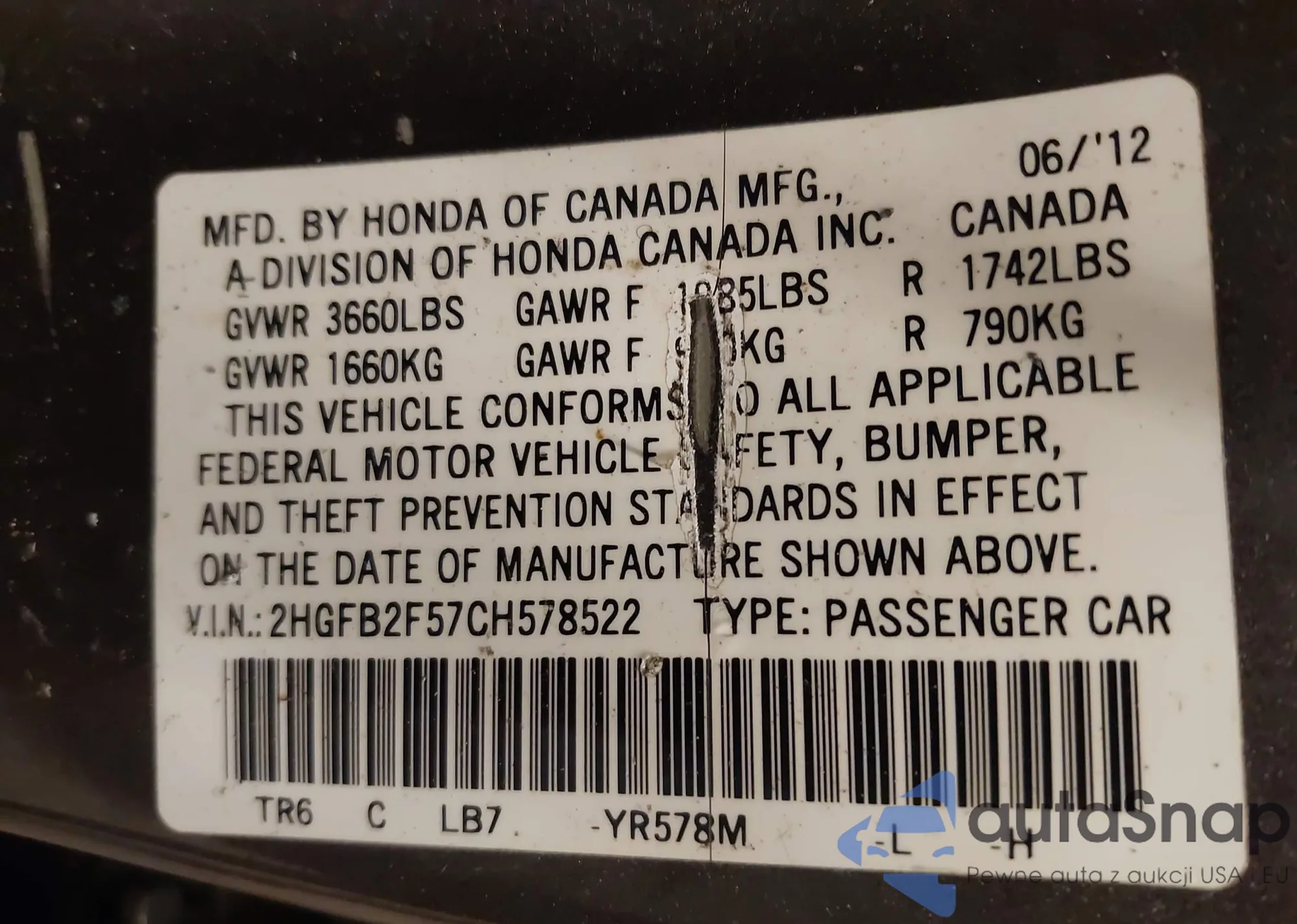 LOT: 44016983 VIN: 2HGFB2F57CH578522