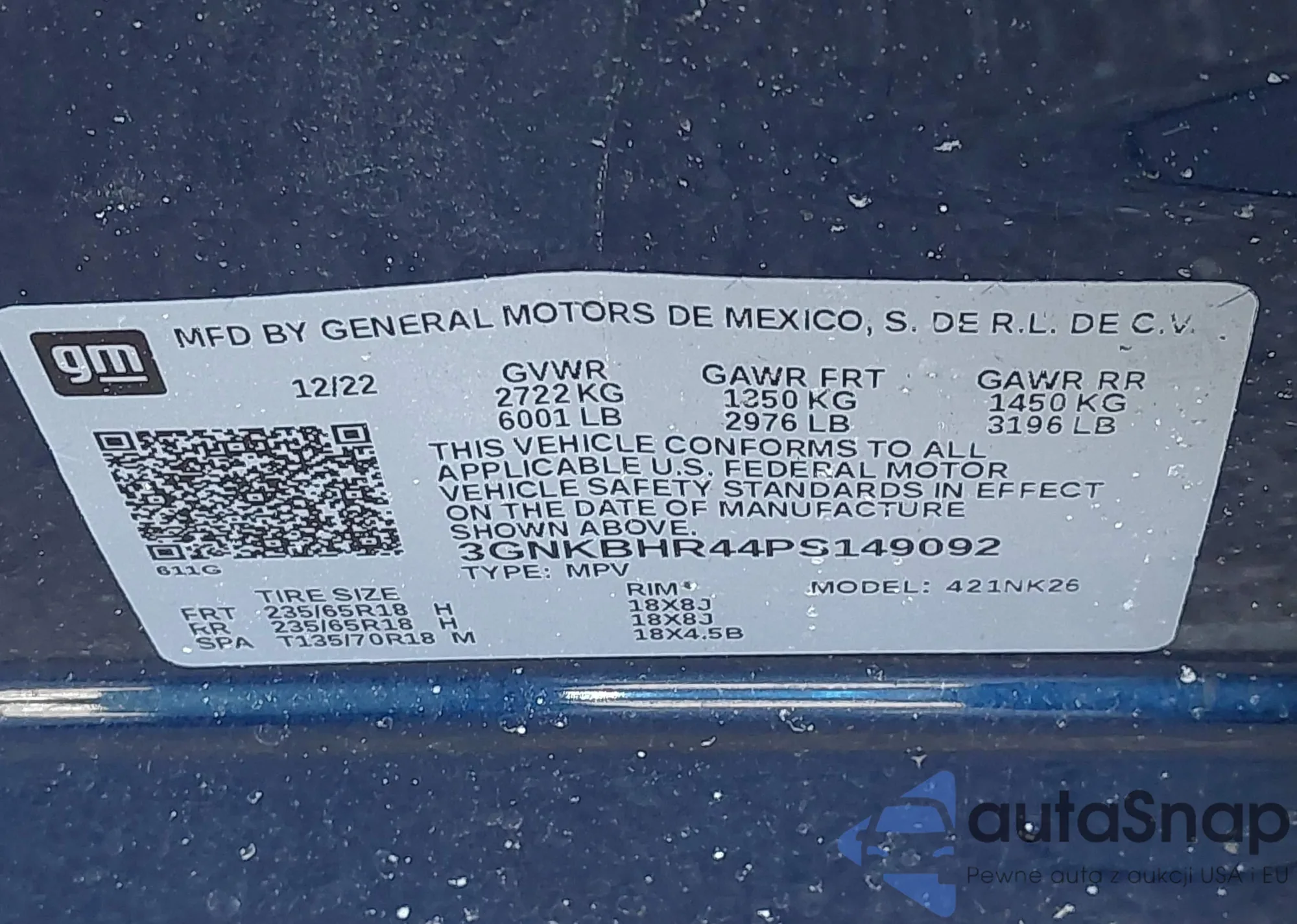 LOT: 43677650 VIN: 3GNKBHR44PS149092